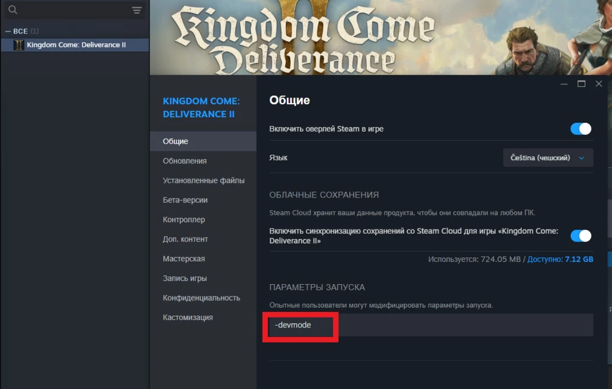 Чтобы начать, найдите Kingdom Come: Deliverance II в вашей библиотеке Steam, кликните правой кнопкой мыши по названию игры и выберите «Свойства». Затем появится окно, в котором в поле «Параметры запуска» нужно ввести команду -devmode.