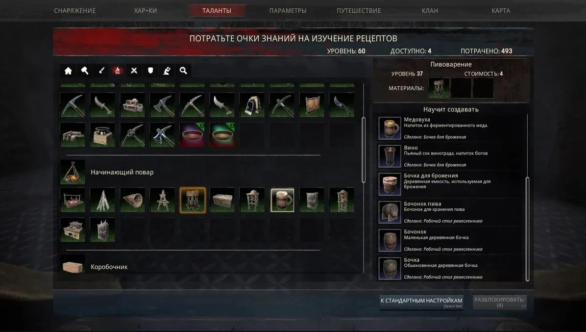 Рецептов выпивки в игре довольно много. Изначально, выучив лишь талант Пивоварения, вы сможете готовить 6-ть напитков. Медовуха и Высокогорное Вино дадут эффекты согревания. А Пиво, Вино, Кактусовое Вино и Пустынное Вина, позволят охладиться.
