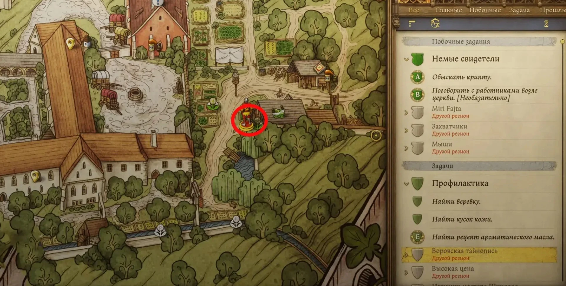 Для начала необходимо завершить сюжетный квест "Анамнез", после чего станет доступна миссия "Профилактика", в рамках которой вам будет поручено найти рецепт ароматного масла в библиотеке. Рекомендуется обойти монастырь и войти с южной стороны, чтобы уменьшить риск обнаружения стражниками.