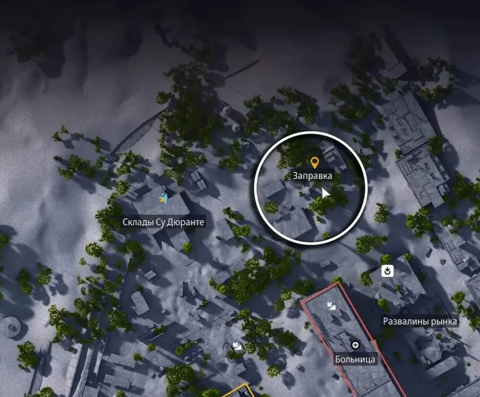 Сама заправка представляет собой разрушенное здание, окруженное техникой. Ищите большую открытую площадку с топливораздаточными колонками и грузовиком, который послужит вам ориентиром.