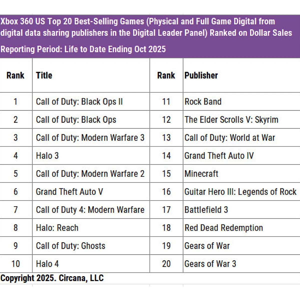 Топ-10 самых продаваемых игр выглядит следующим образом: Halo 3, Call of Duty: Modern Warfare 2, GTA 5, Call of Duty 4: Modern Warfare, Halo: Reach, Call of Duty: Ghosts, Halo 4.