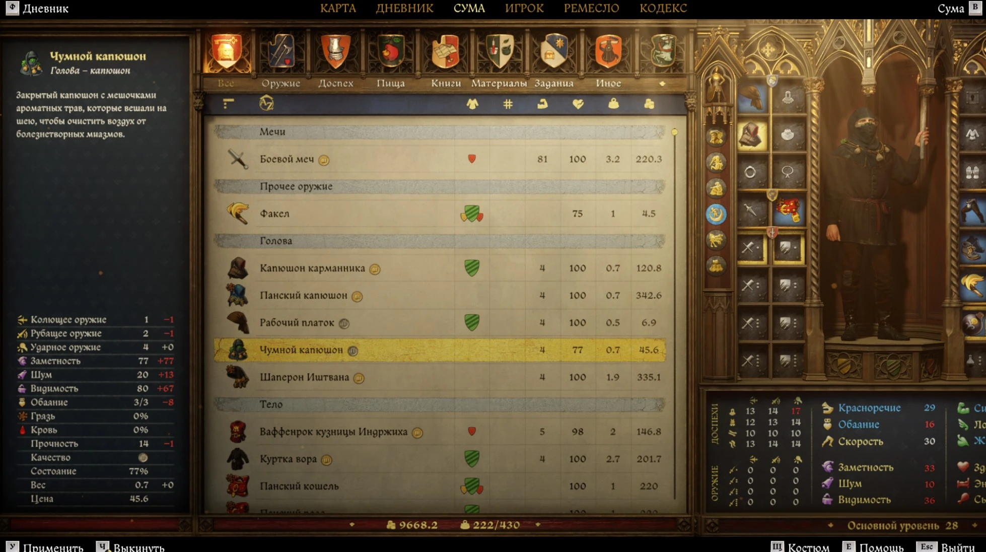 Наденьте его вместо обычного головного убора, и никакая зараза вам не страшна. Помните, что это не просто предосторожность. Обязательно надевайте капюшон в подземельях и рядом с трупами, иначе ваш персонаж начнет кашлять и может заразиться болезнью. Она не смертельна, но снижает здоровье на 3, силу и ловкость на 2 навсегда.