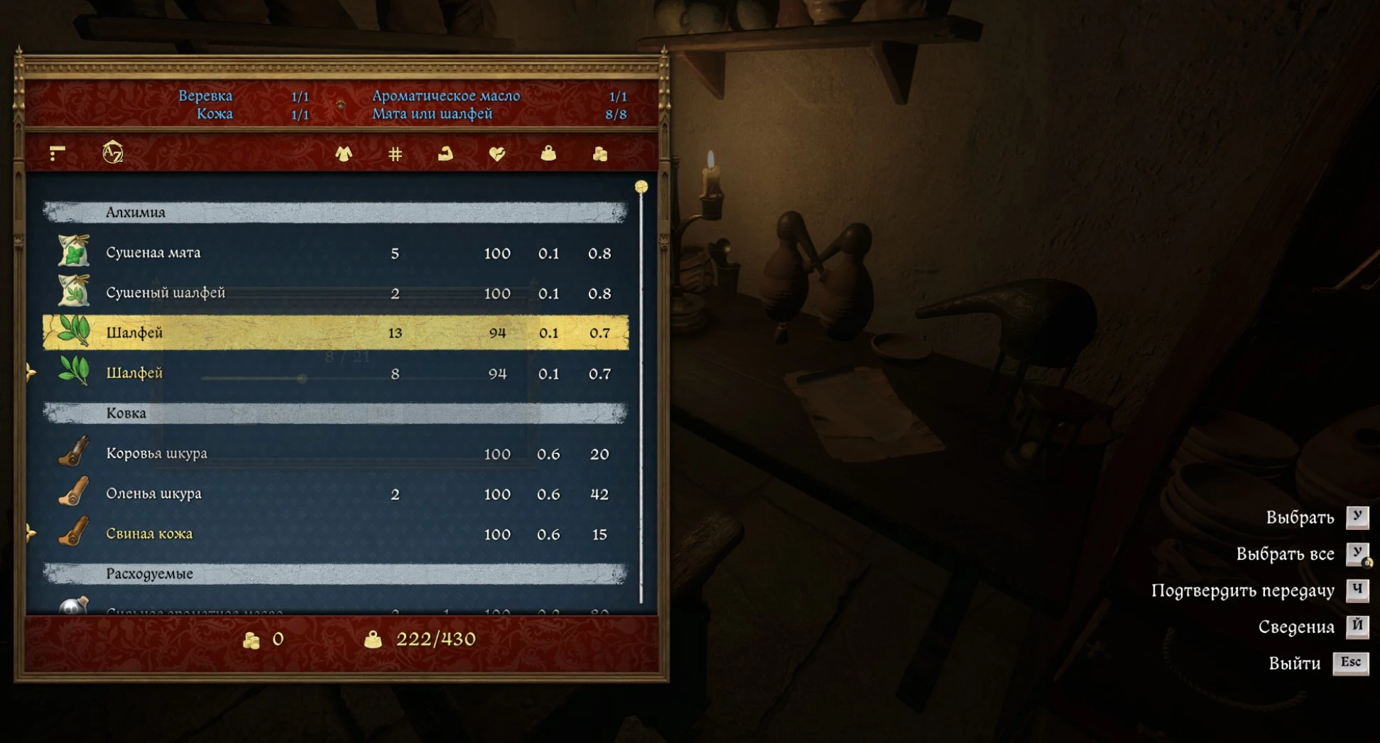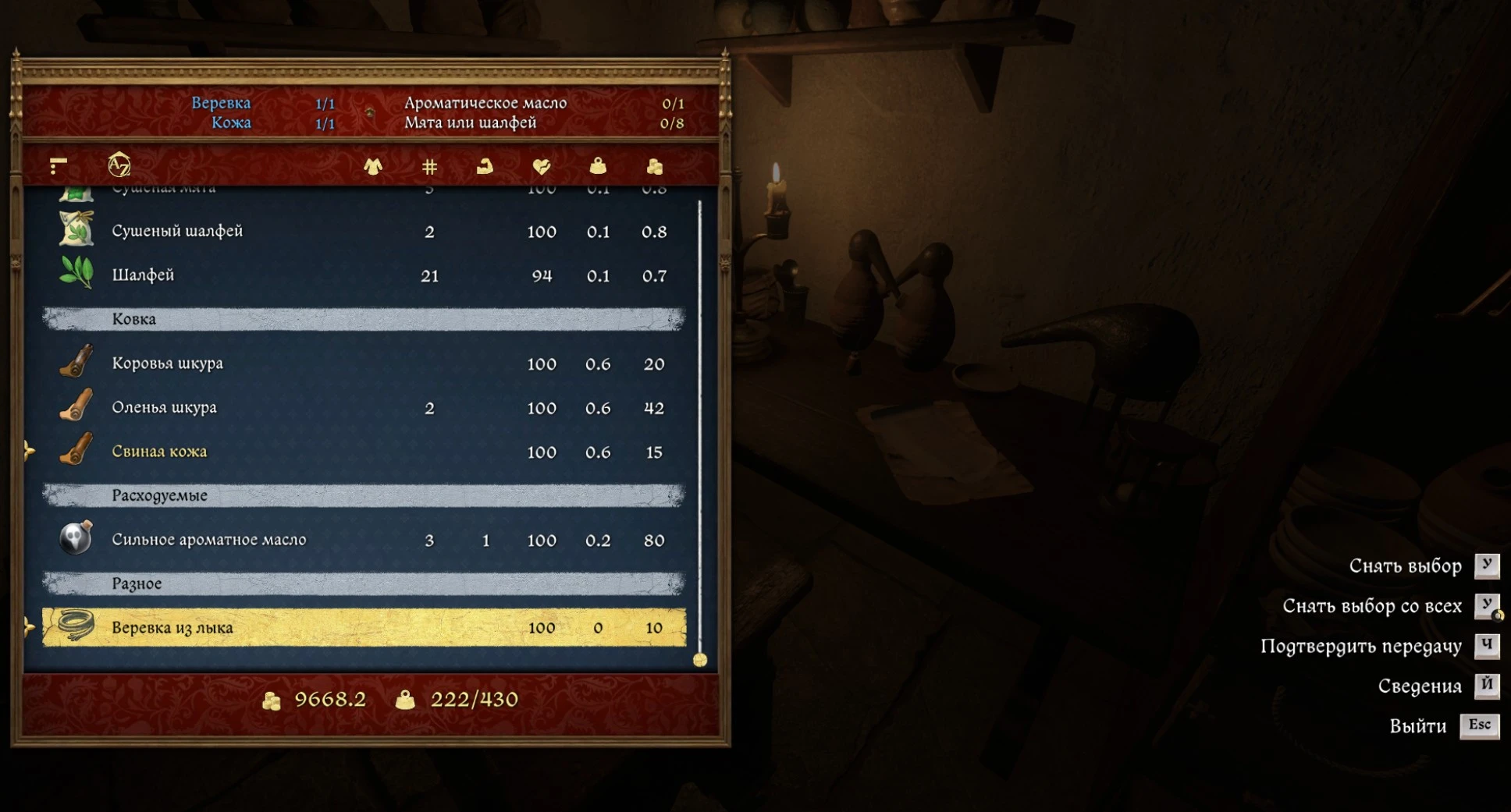 Затем выберите из инвентаря веревку, кожу или шкуру, восемь единиц мяты или шалфея и, конечно же, ароматическое масло. После этого ваш чумной капюшон будет готов.