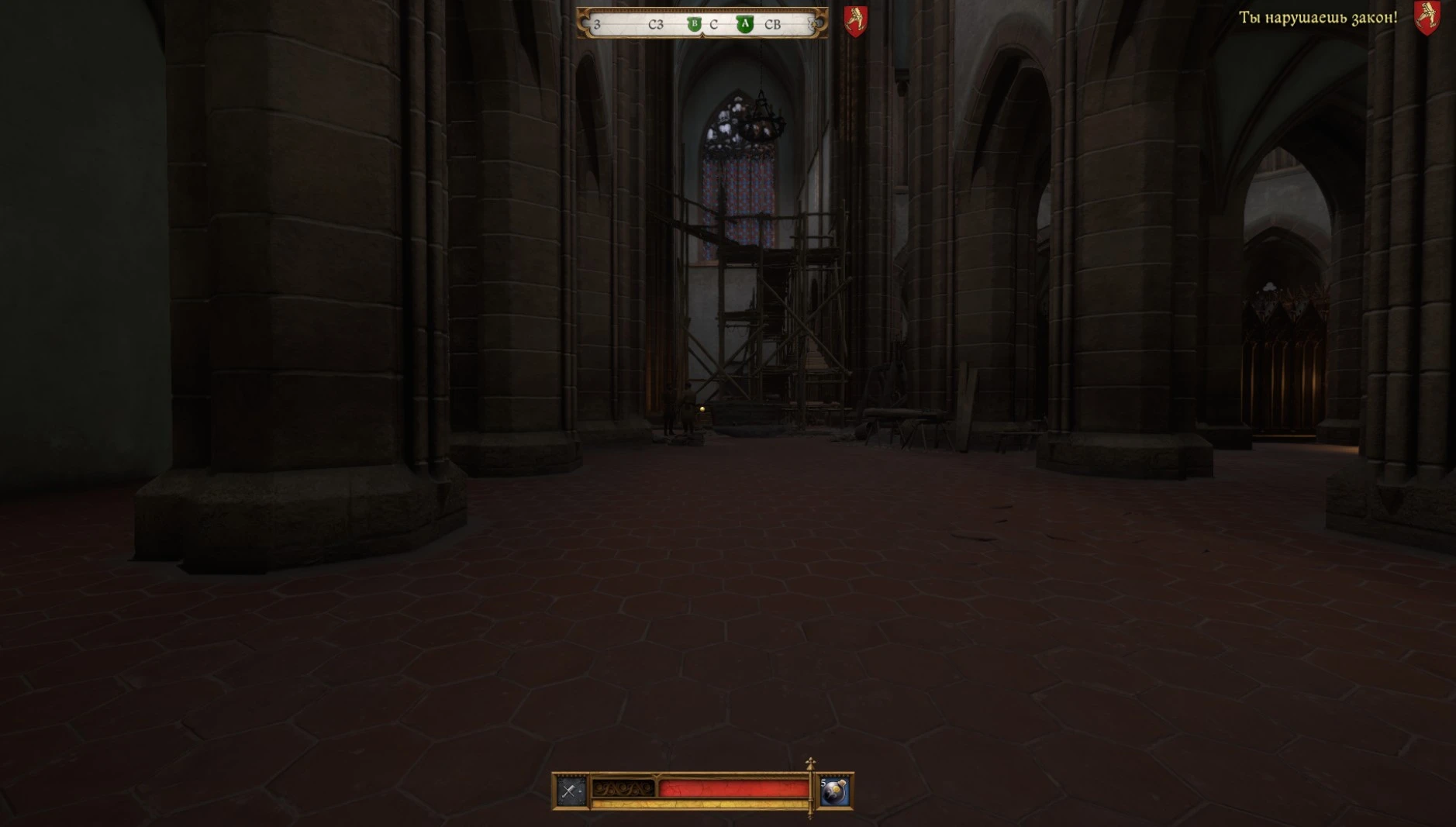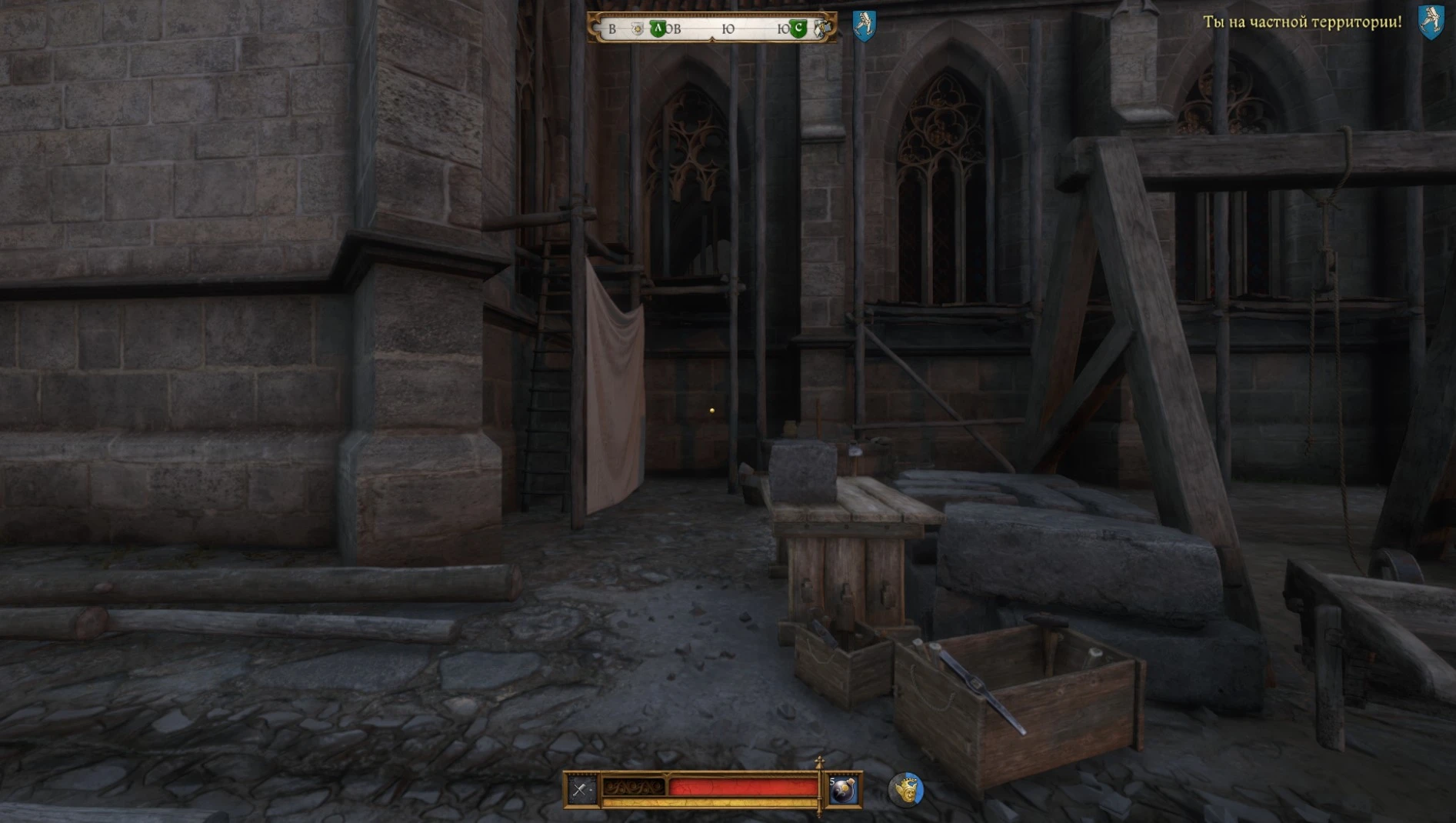 Затем, справа от входа в собор, вы обнаружите строительные леса со скромной лестницей. Она ведет к оконному проему, который позволит вам проникнуть внутрь храма, избежав встречи со стражей.