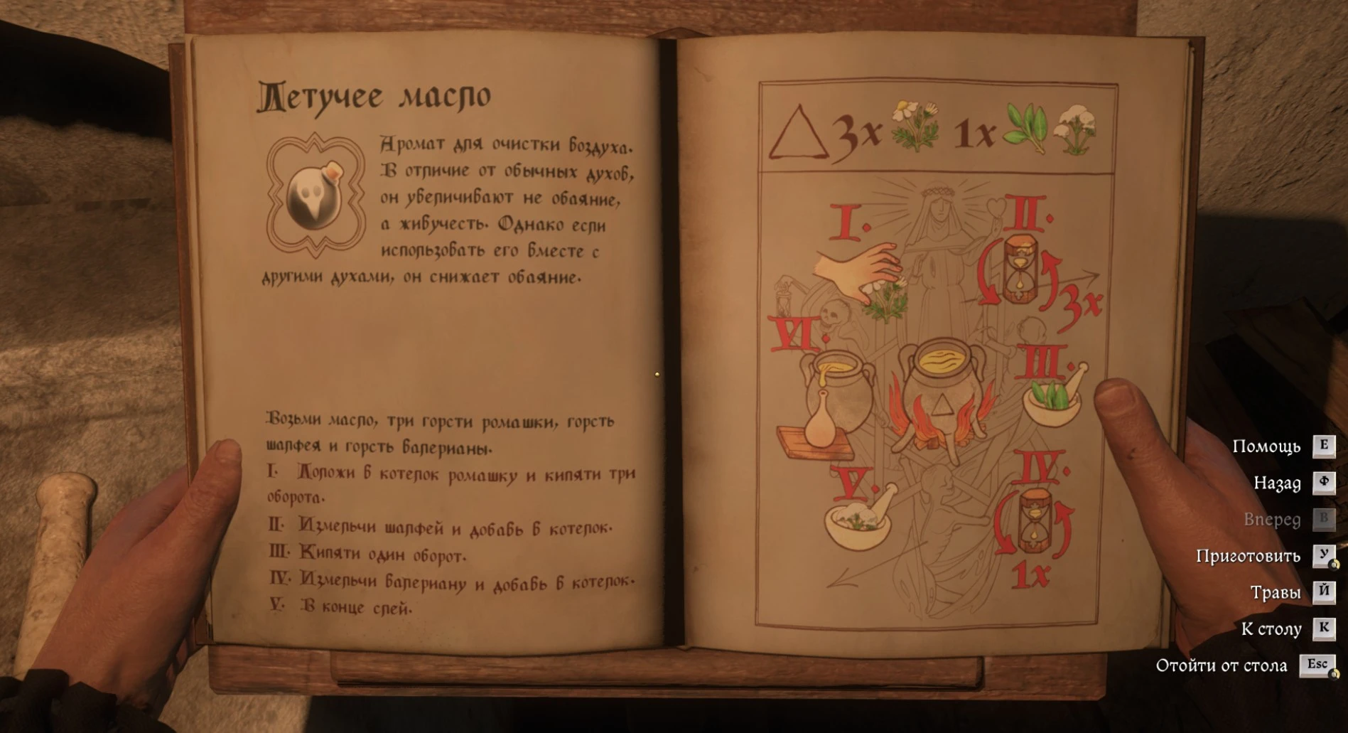 Разместите шалфей, ромашку и валериану с полки инвентаря на левую полку. Возьмите масло с правой стороны и добавьте в котел. Варите смесь в течение указанного в рецепте времени, отсчитываемого песочными часами.