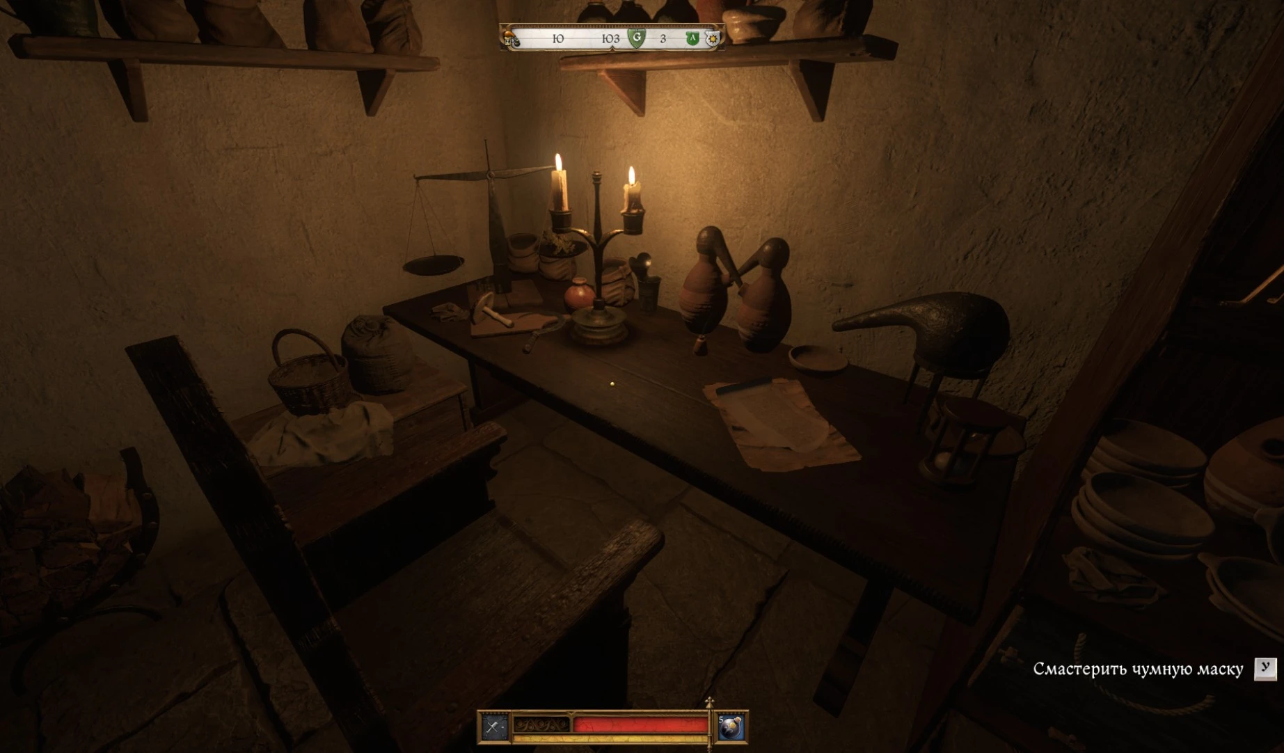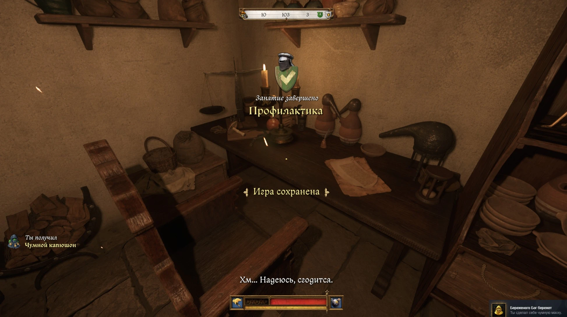 Когда выяснится, что источник неизвестной болезни находится в склепе под монастырем, Альбикус и его коллега Захариаш предложат вам отправиться туда. Будучи врачами, а не убийцами, они расскажут о мерах предосторожности, которые применялись во время чумы для снижения риска заражения. Речь идет о специальном капюшоне и маске с фильтром из трав и ароматического масла.