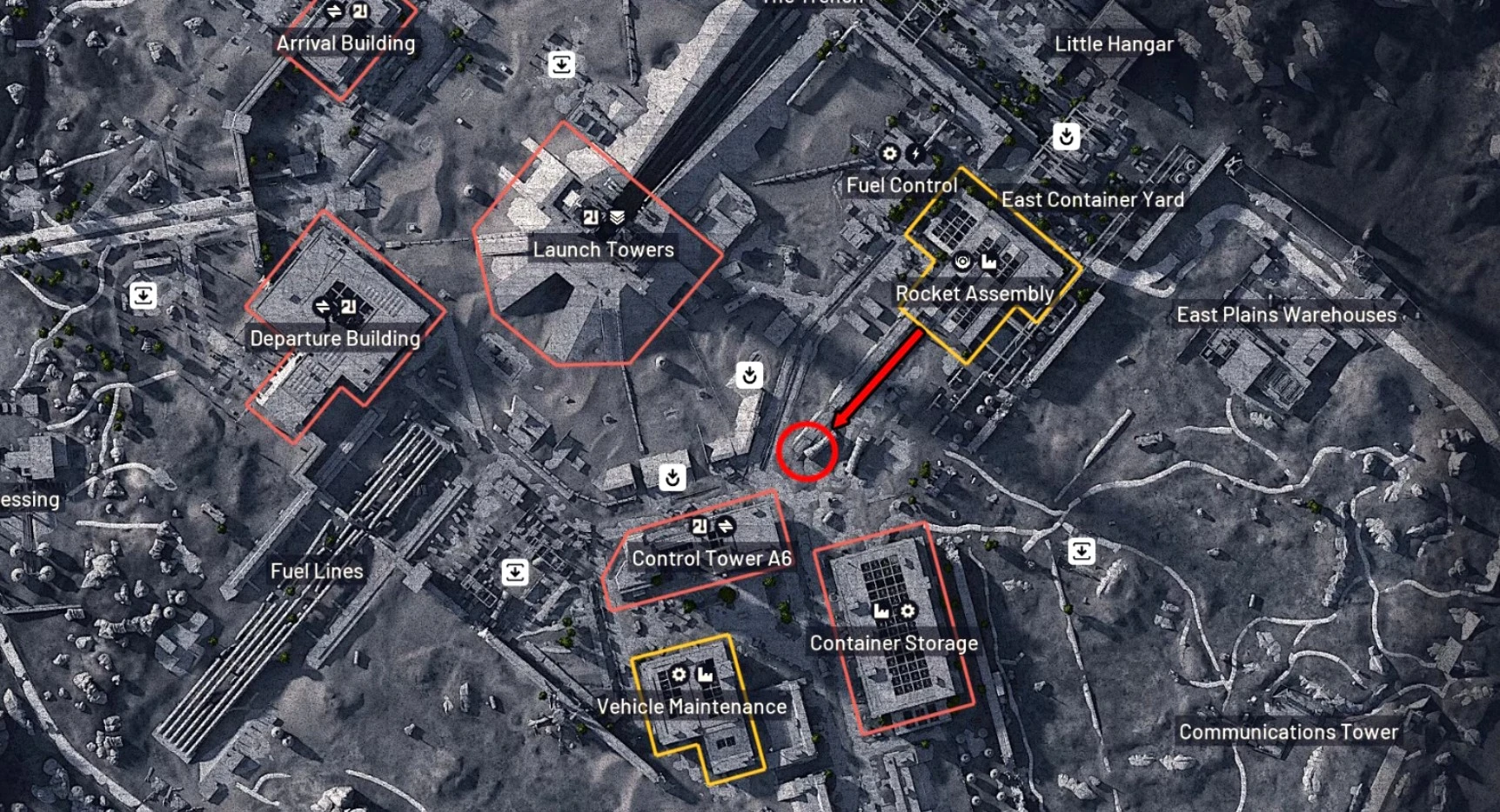 Последнее место, которое вам нужно посетить для выполнения задания Селесты, находится на карте «Космопорт». Отправляйтесь туда и двигайтесь вниз по карте от локации «Цех сборки ракет». Несмотря на то, что это место кажется самым простым из всех трех (достаточно просто подойти достаточно близко к нужной конструкции, чтобы задача была автоматически выполнена), оно расположено в одной из самых опасных зон на карте.