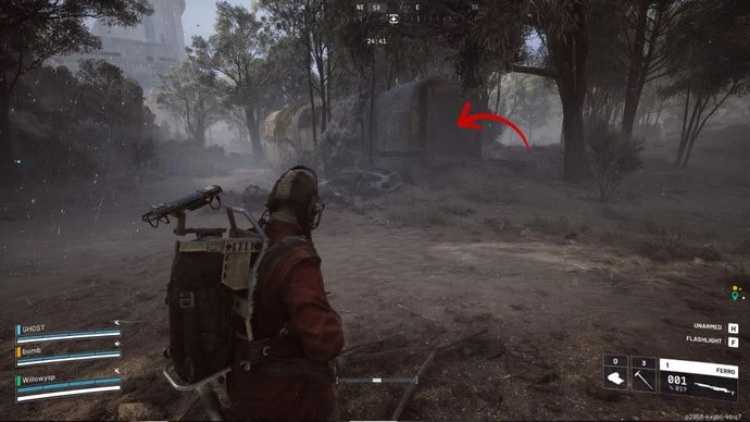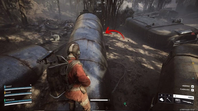 Фактически, это огромные трубы, наполовину вкопанные в землю. Подойдите к той, что выступает из земли, и ищите рядом с ней предмет, подсвеченный жёлтым цветом.