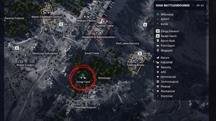 Все три предмета находятся на свалке металлолома в нижней части карты "Поле битвы у дамбы". Откройте карту и поставьте метку в лесной зоне слева от "Комнаты испытаний", чтобы легко найти нужное место. Доберитесь до южной части свалки, чтобы активировать выполнение первой задачи.