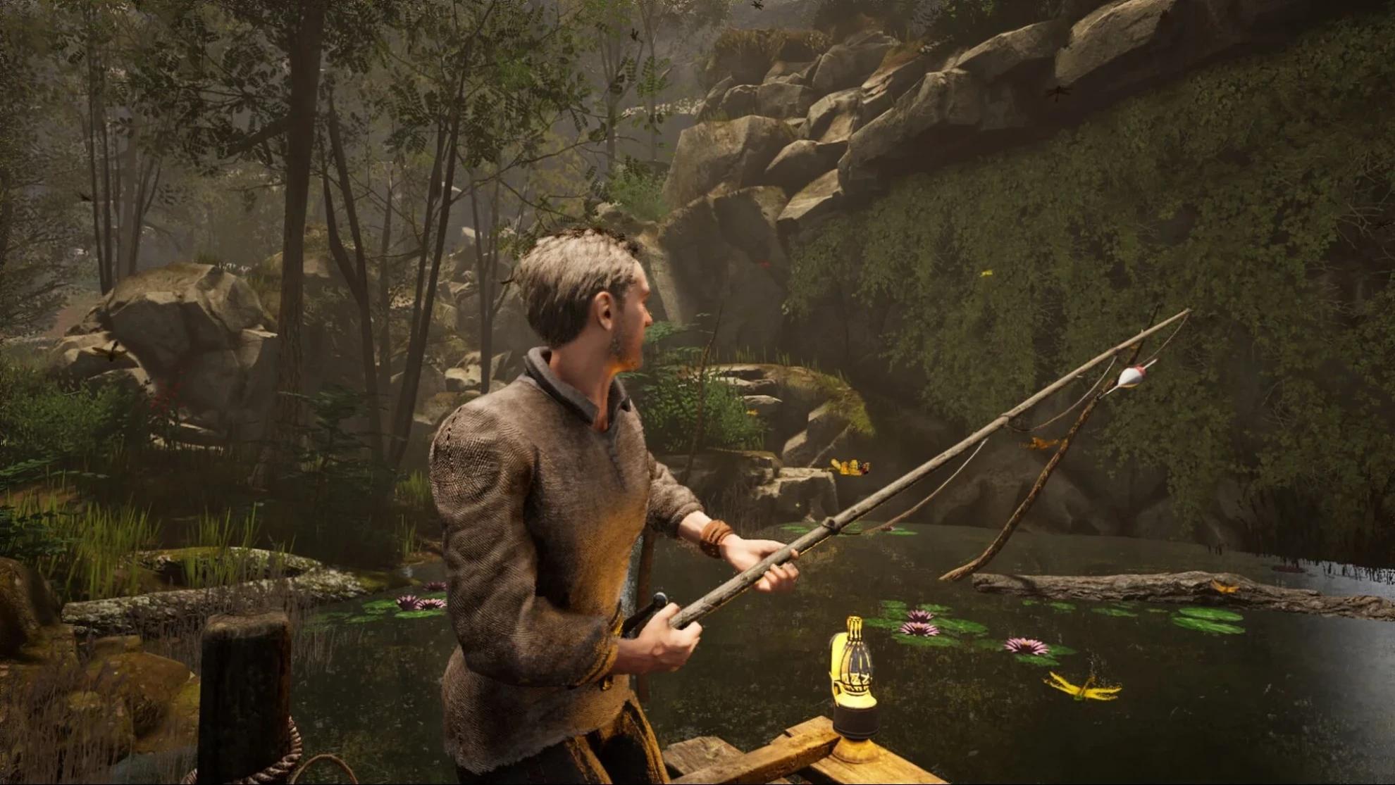 Важная особенность игровой механики заключается в том, что удочка не добавляется в ваш инвентарь как постоянный предмет. Это стационарное снаряжение, которое всегда остается на месте рыбалки. Вы просто берете его в руки для использования, а закончив ловлю, оставляете там же.