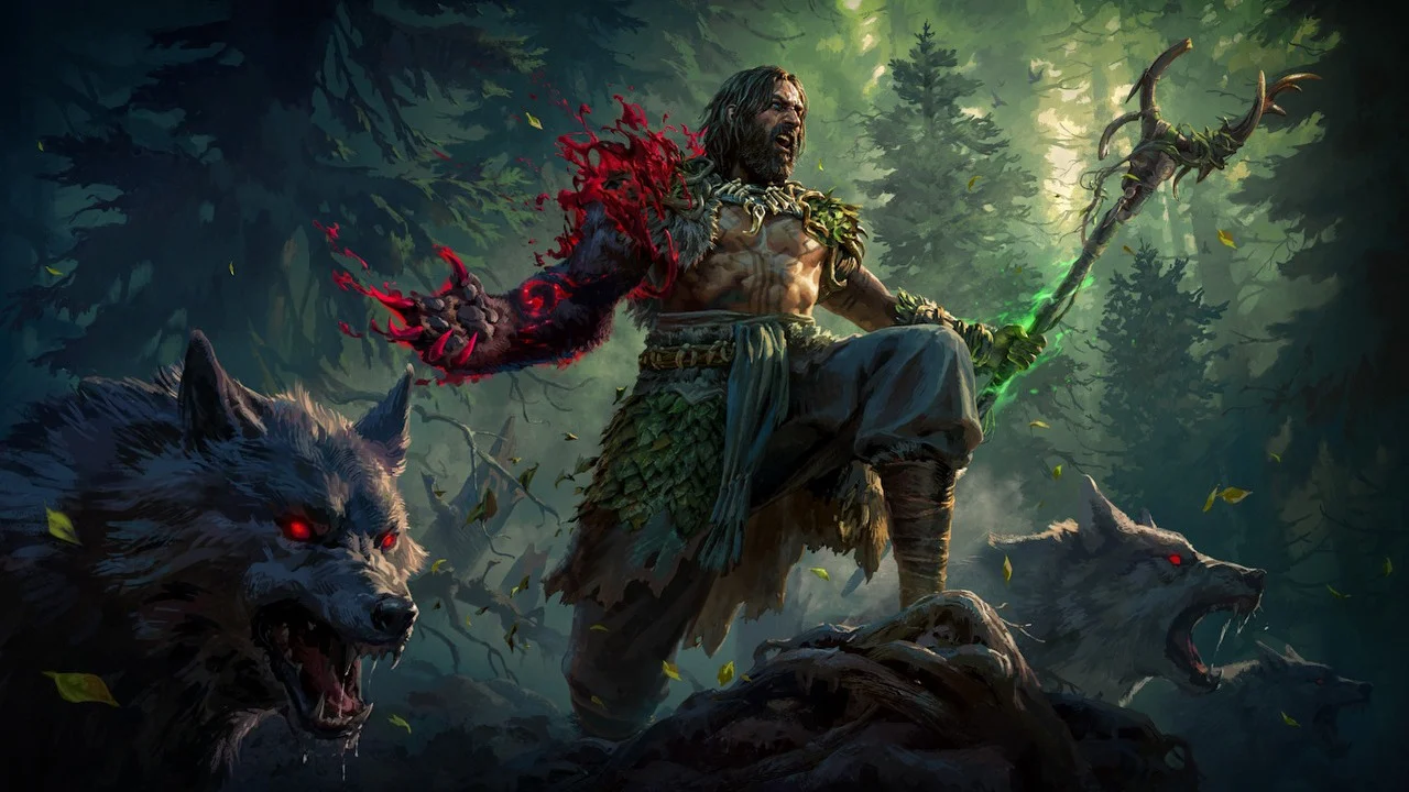 Доступны три формы: Волк (быстрый, замораживающий), Медведь (медленный, сильный, накапливающий ярость), и Виверна (летающая, атакует когтями и молниями). Друиды начинают с классов Восхождения Шамана (усиление стихийных заклинаний) и Оракула (предвидение).