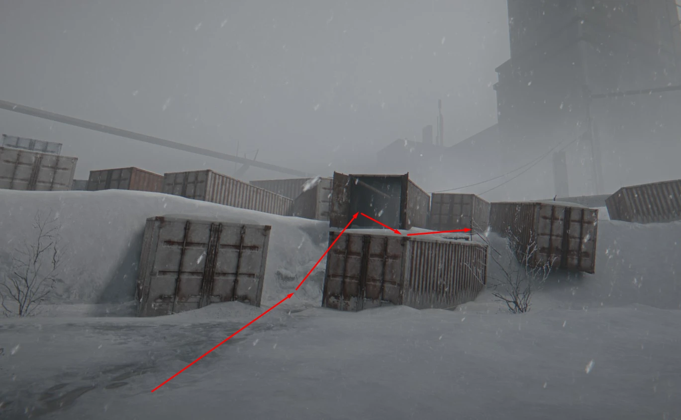 При попытке вернуться под контейнером, появится робот. Быстро вернитесь к трансформатору, чтобы избежать раздавливания персонажа. Найдите открытый контейнер сбоку и следуйте через него. Справа находится контейнер с верстаком и ресурсами, а слева – ещё один, ведущий наружу. Не спешите спрыгивать вниз с левой стороны. Вместо этого, совершите прыжок с разбега на контейнер немного левее, развернитесь и пройдите по тропинке к яме. Спуститесь в яму и исследуйте слой льда, чтобы найти странное существо и получить достижение "Нечто".