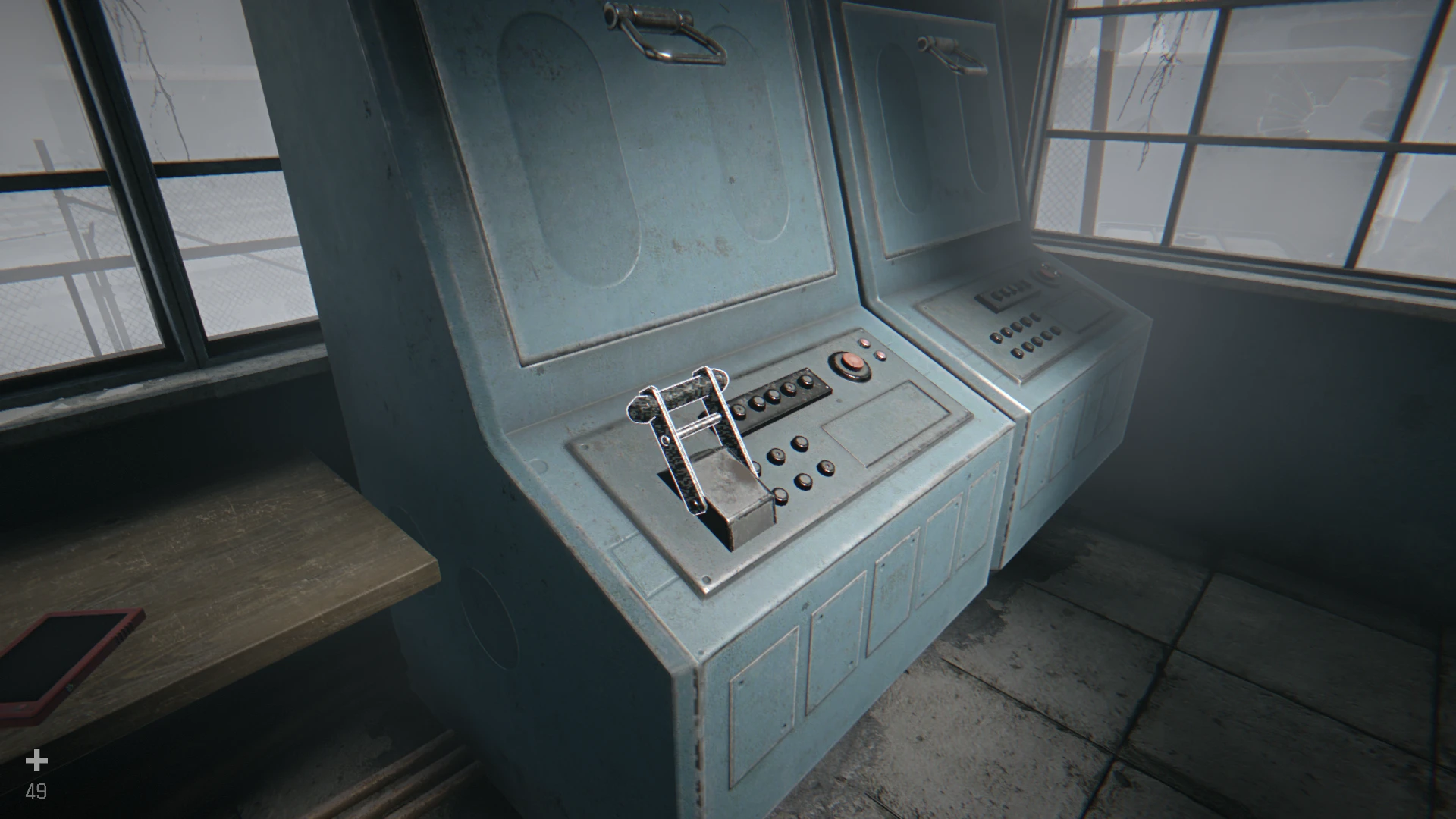 Внутри станции, на столе расположен планшет, а справа – некое оборудование. Попытка использовать рычаг окажется безуспешной.