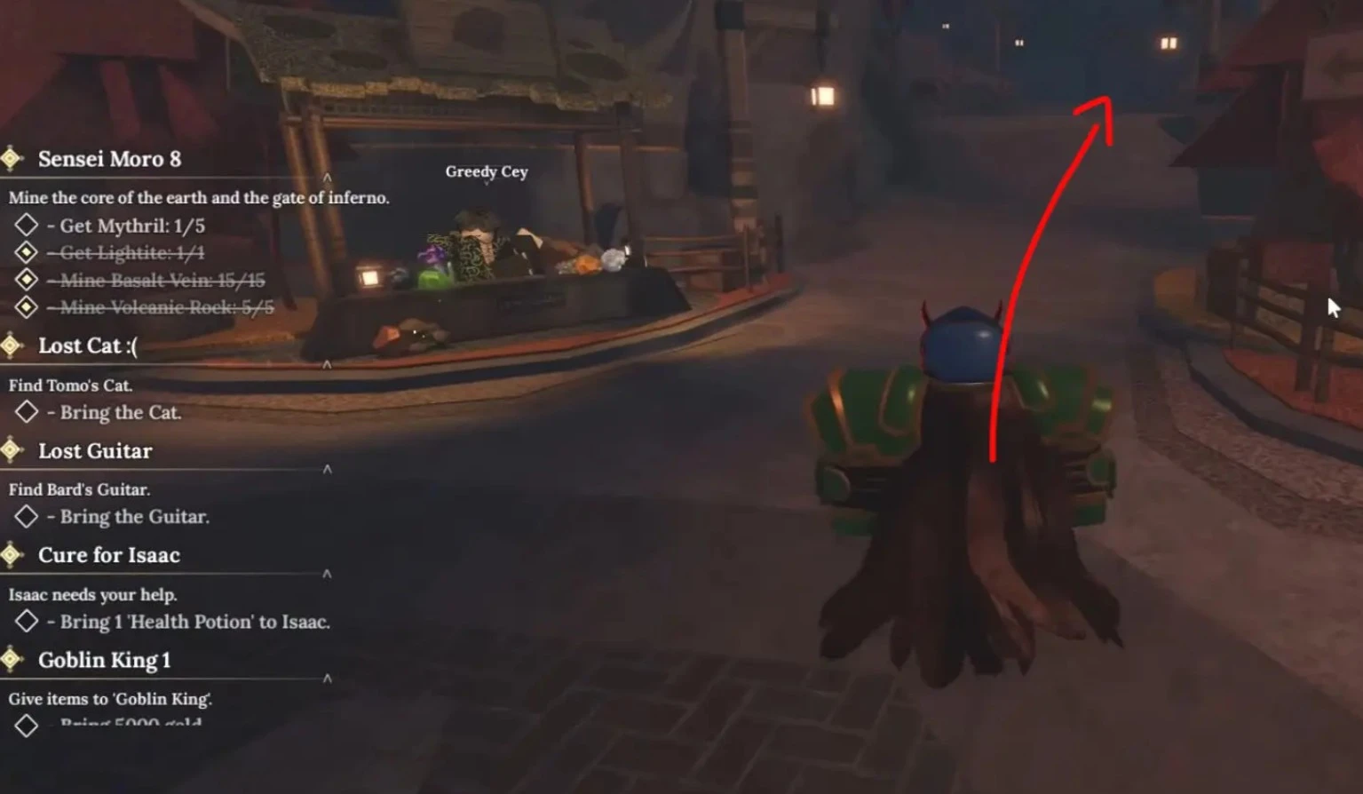 Сразу после телепортации поверните направо и следуйте по тропинке мимо лавки Жадного Сея (Greedy Cey), затем поверните налево и пройдите через открытые ворота на площадь, где снова поверните налево. Поднимитесь наверх, и вы попадете в небольшой лагерь. Исаак сидит возле костра в одной из палаток – подойдите и начните разговор.
