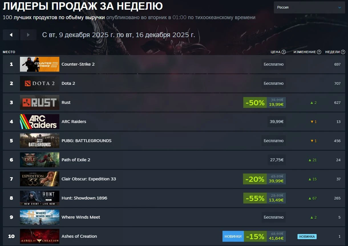 В российском регионе также произошли изменения. Rust поднялся на две строчки, сместив ARC Raiders с третьего места. Значительный скачок совершили Expedition 33 и Path of Exile 2.