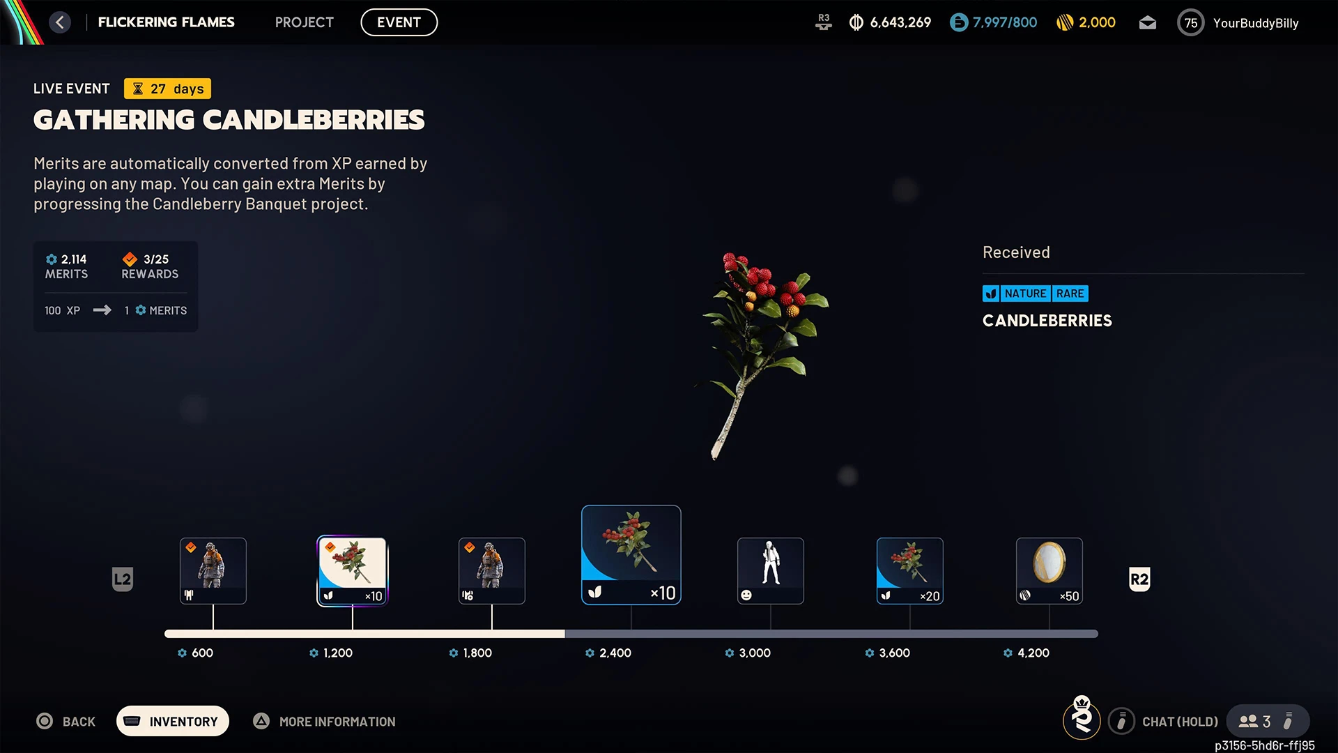 Есть способ полегче — просто прокачивать цепочку наград ивента "Сбор ягод Candleberries". За весь ивент можно получить 180 ягод, причём для этого даже не надо специально их искать. Просто играй, фарми опыт (он конвертится в очки Заслуг), и ягоды сами прилетят в инвентарь.