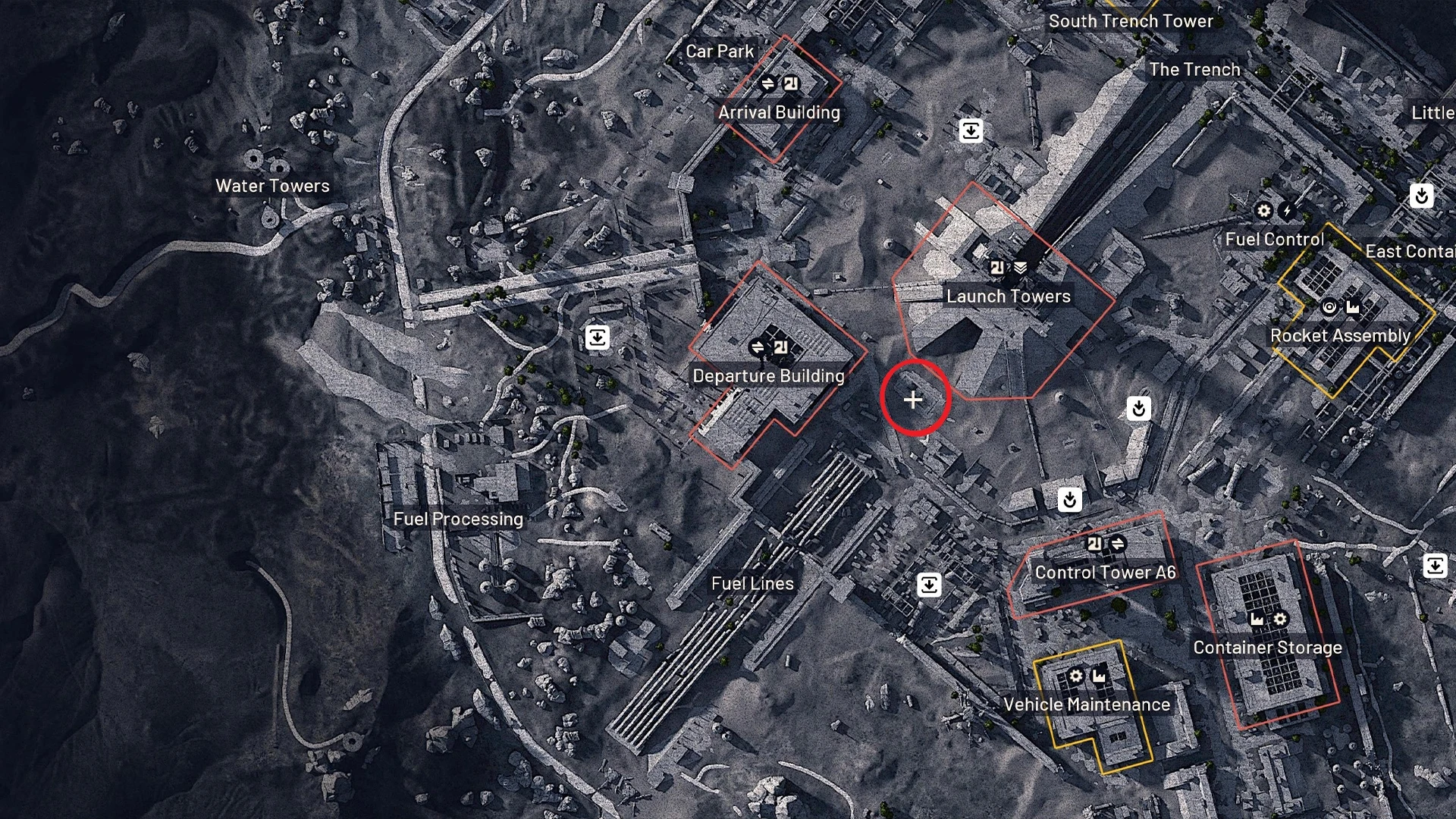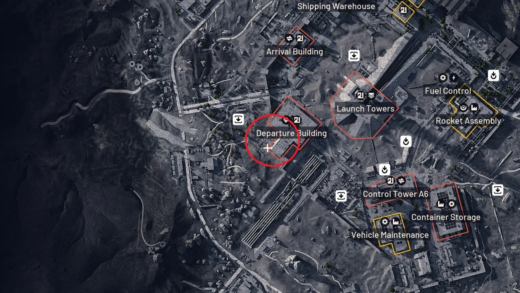 Первая точка — здание вылета на космодроме. Найти его несложно: оно торчит почти в центре карты, чуть западнее стартовой башни.