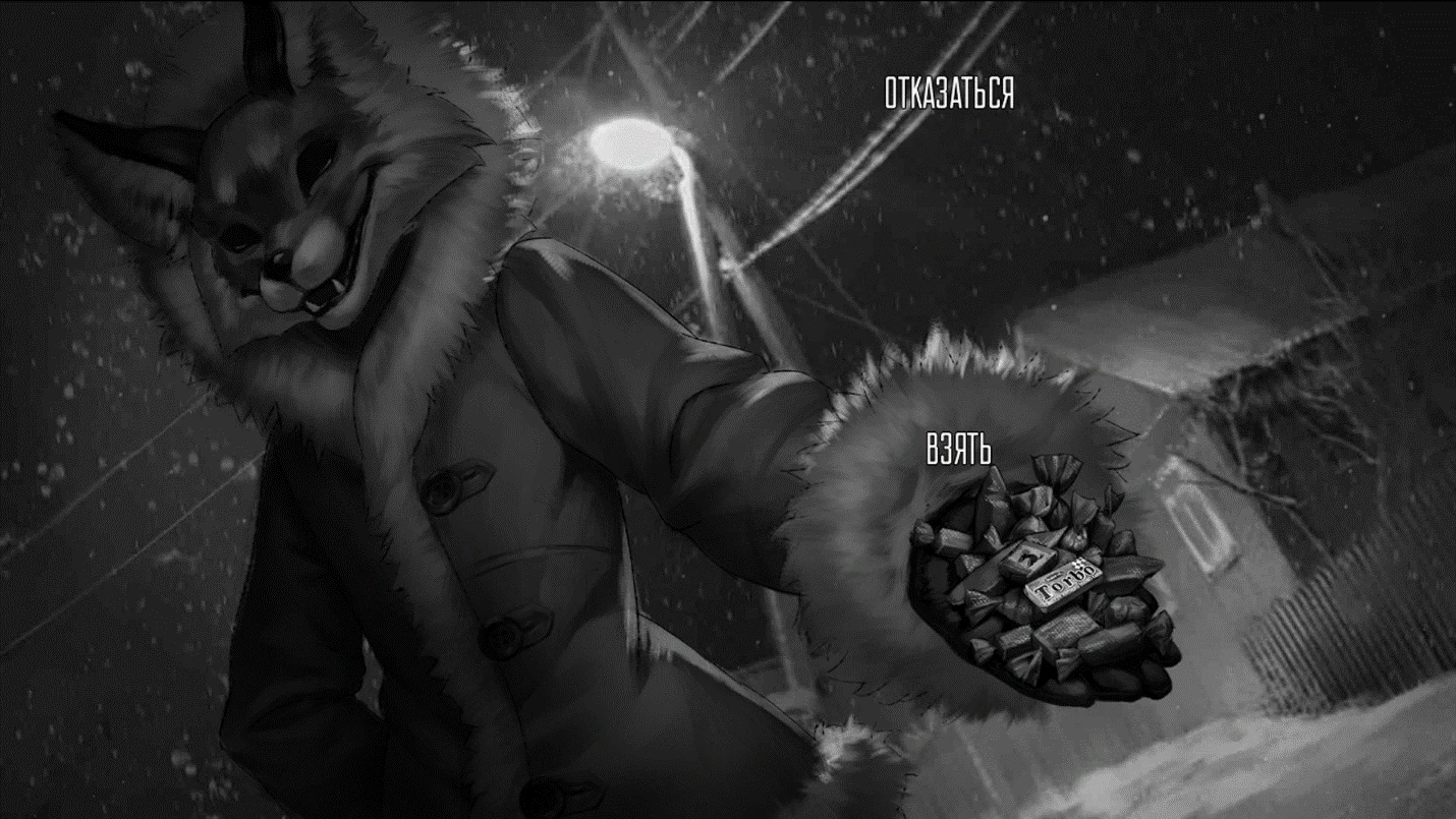 Как и предыдущее, доступно на любой ветке. Встретив лису, выслушайте ее, но откажитесь от предложенного угощения. Лиса не обидится, вы получите ачивку "Гадость", но закроете себе путь к лучшим концовкам и спасению многих персонажей.