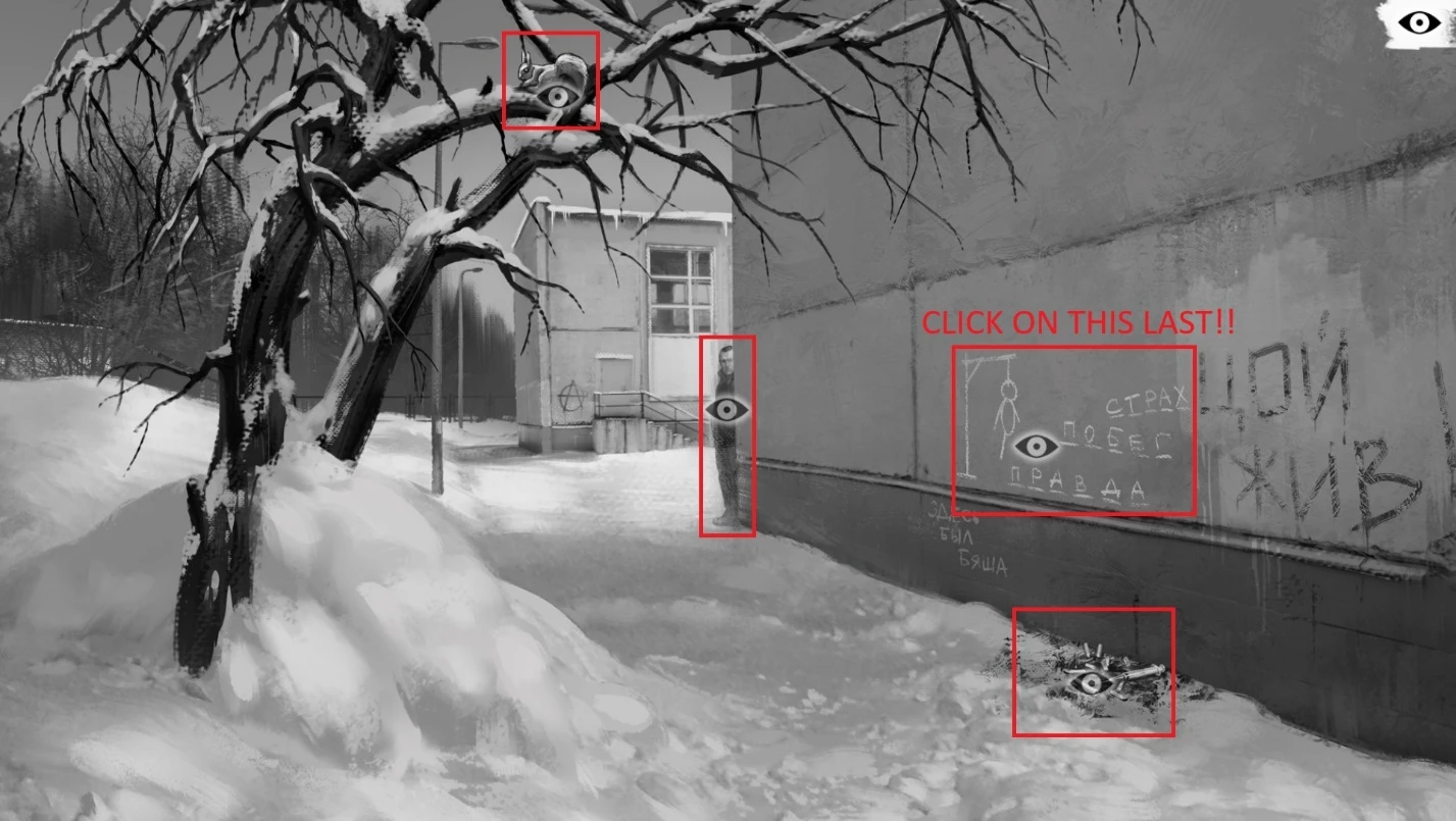 Незнакомец, скрывающийся за углом здания. Мусор (шприцы, окурки) у стены справа, под граффити. Белка на дереве слева. Надписи на стене справа.
