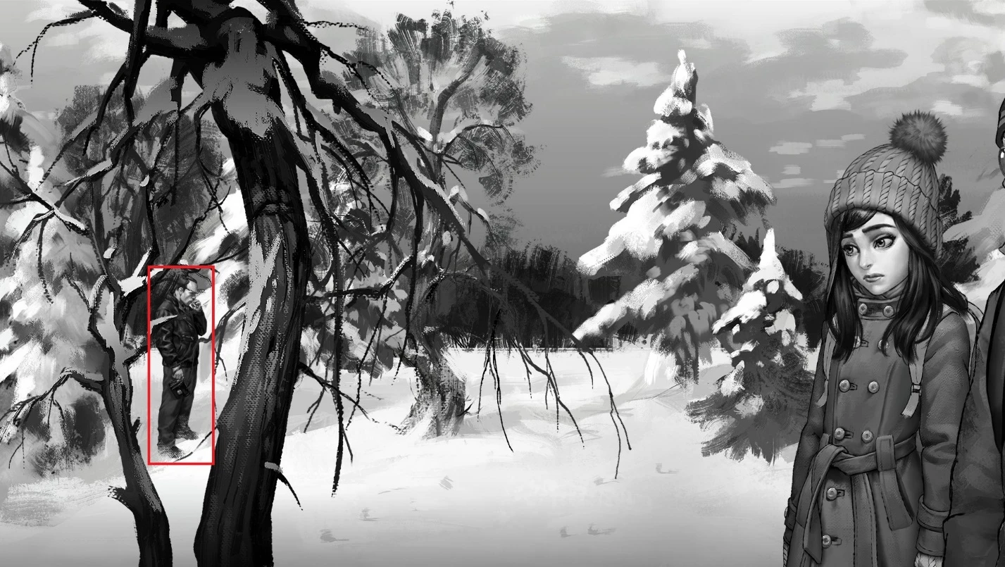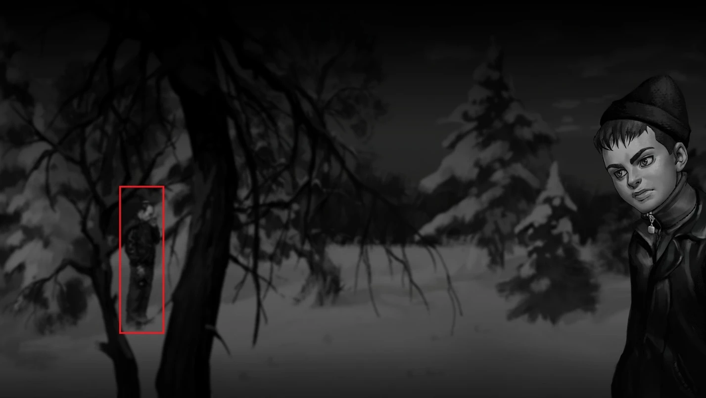 Наконец, вы увидите незнакомца на заднем плане, идя из школы с Полиной или Ромкой и Бяшей, в лесу, неподалеку от трактора. Если вы следуете по пути Полины, достаточно осмотреть незнакомца в первом и втором местах, так как по сюжету вы не попадаете во двор. Идеальный фоторобот показан на скриншоте ниже.