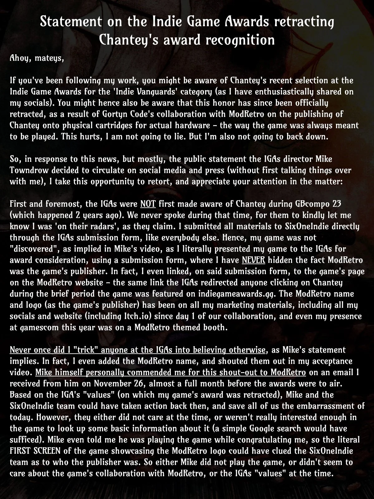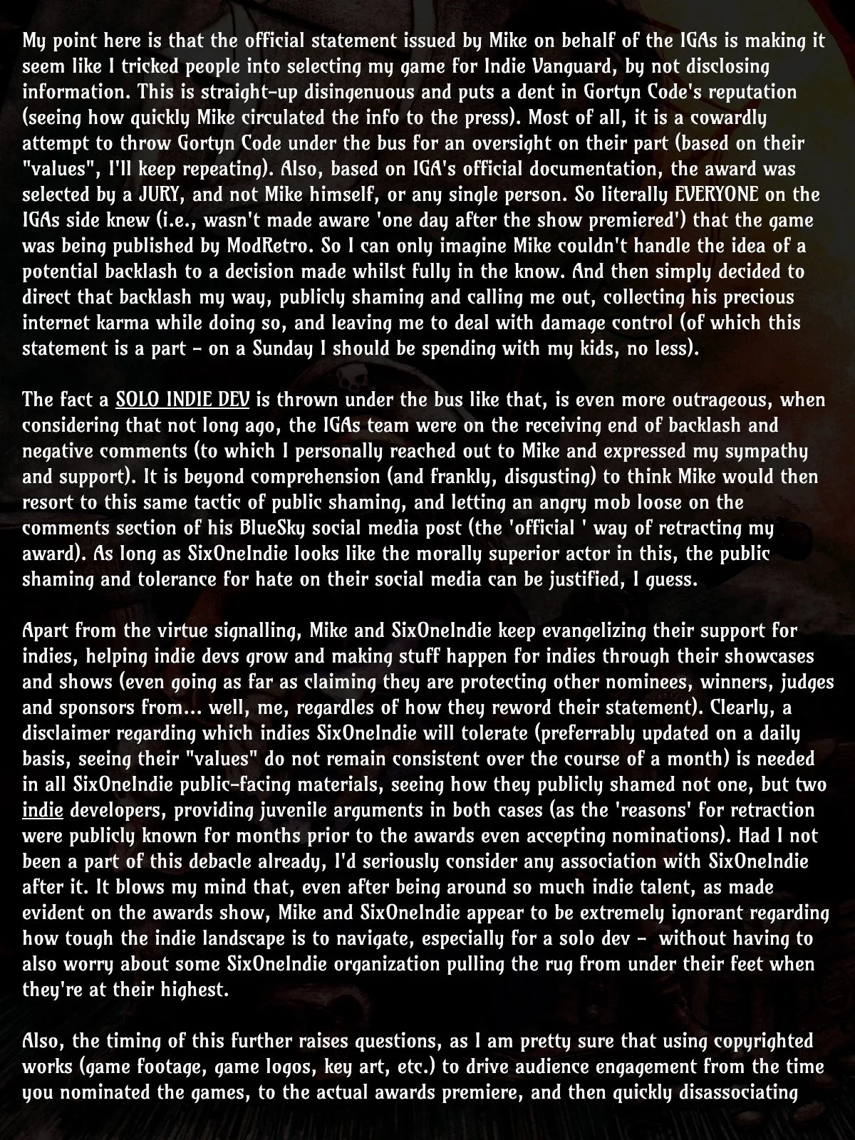 Gortyn Code выразил несогласие с таким решением, особенно с тем, как это было представлено The Indie Game Awards. Разработчик утверждает, что сотрудничество с ModRetro не скрывалось и было известно организаторам и членам жюри. Более того, продюсер премии лично высоко оценил Gortyn Code за прозрачное указание издателя.