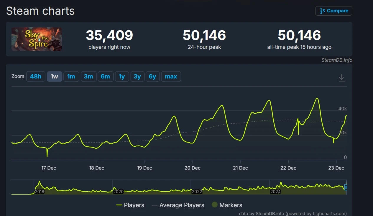 Неожиданный всплеск интереса к карточной игре Slay the Spire привёл к тому, что в Steam одновременно играли более 50 тысяч человек. Это максимальное число игроков онлайн за всю историю игры, спустя почти семь лет после её выхода!