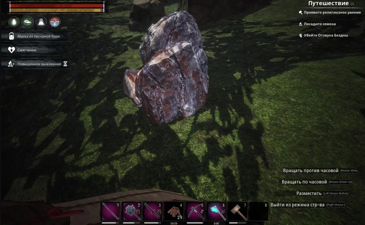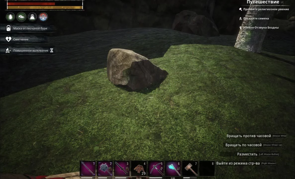 Камни – валяются по всем Землям Изгнанников. Те что поменьше можно просто подбирать, те что побольше нужно разбивать инструментами. Как и дерево, камни можно собирать и киркой, и топором, но использование кирки дает в два раза больше ресурсов. При добыче камней из валунов, есть небольшая вероятность добыть немного железа и угля. Камни – это второй ингредиент необходимый для производства строительных блоков 1-го уровня. Кроме этого они используются в постройке различных производственных станков, в производстве простенького оружия и инструментов, в изготовлении предметов мебели и интерьера. Отличным местом фарма камней станет пещера Челюсть, расположенная в квадрате C6. За один заход из неё можно вынести до 10-ти тысяч камней, добыв их буквально за пару минут.