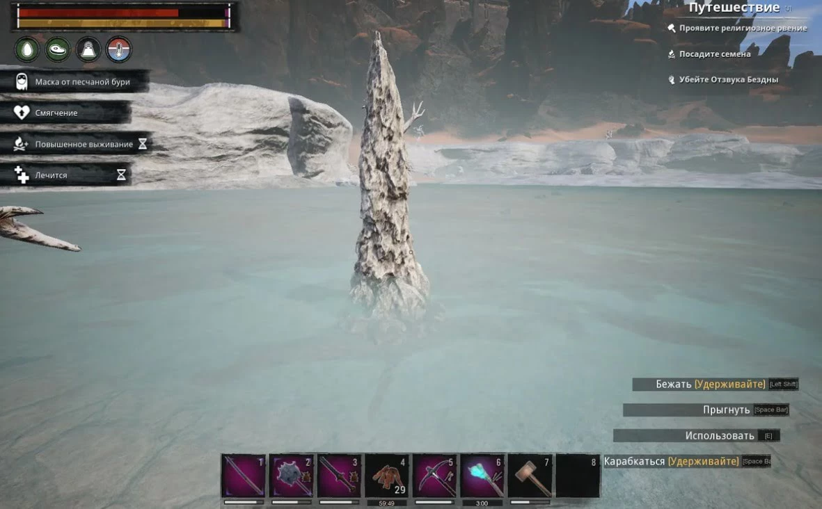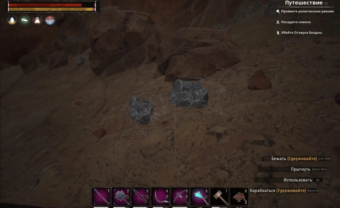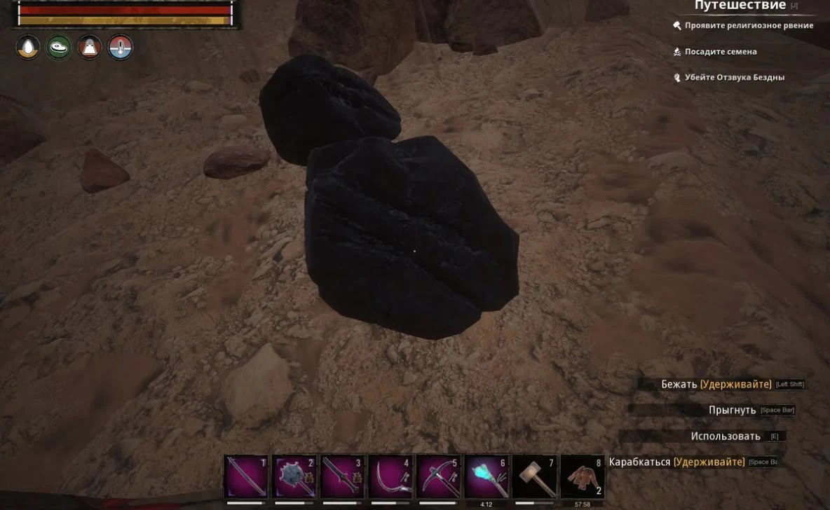 Месторождение железа.Уголь – Внешне места добычи угля представляют собой небольшие черные булыжники. Большей частью залежи угля расположены в пустынных районах Земель Изгнанников. Добытый уголь отлично подходит в качестве топлива для плавильных печей, так же для печек и костров, во время готовки еды. Еще уголь можно использовать для добычи еще одного важного ресурса – дегтя. Правда способ переработки угля в деготь довольно расточителен и неэффективен. Также уголь является одним из ингредиентов для боевых раскрасок, временно дающих полезные баффы.