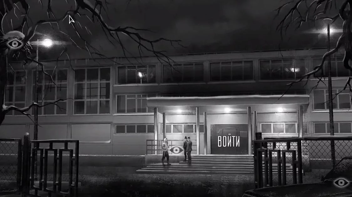 У входа в школу обязательно осмотрите человека в куртке (того самого убийцу с заячьей губой). Этот персонаж также входит в число интерактивных объектов у школы. Кроме него, дважды коснитесь автомобиля "Волга", гнезда на дереве слева и старшеклассников, стоящих у входа.
