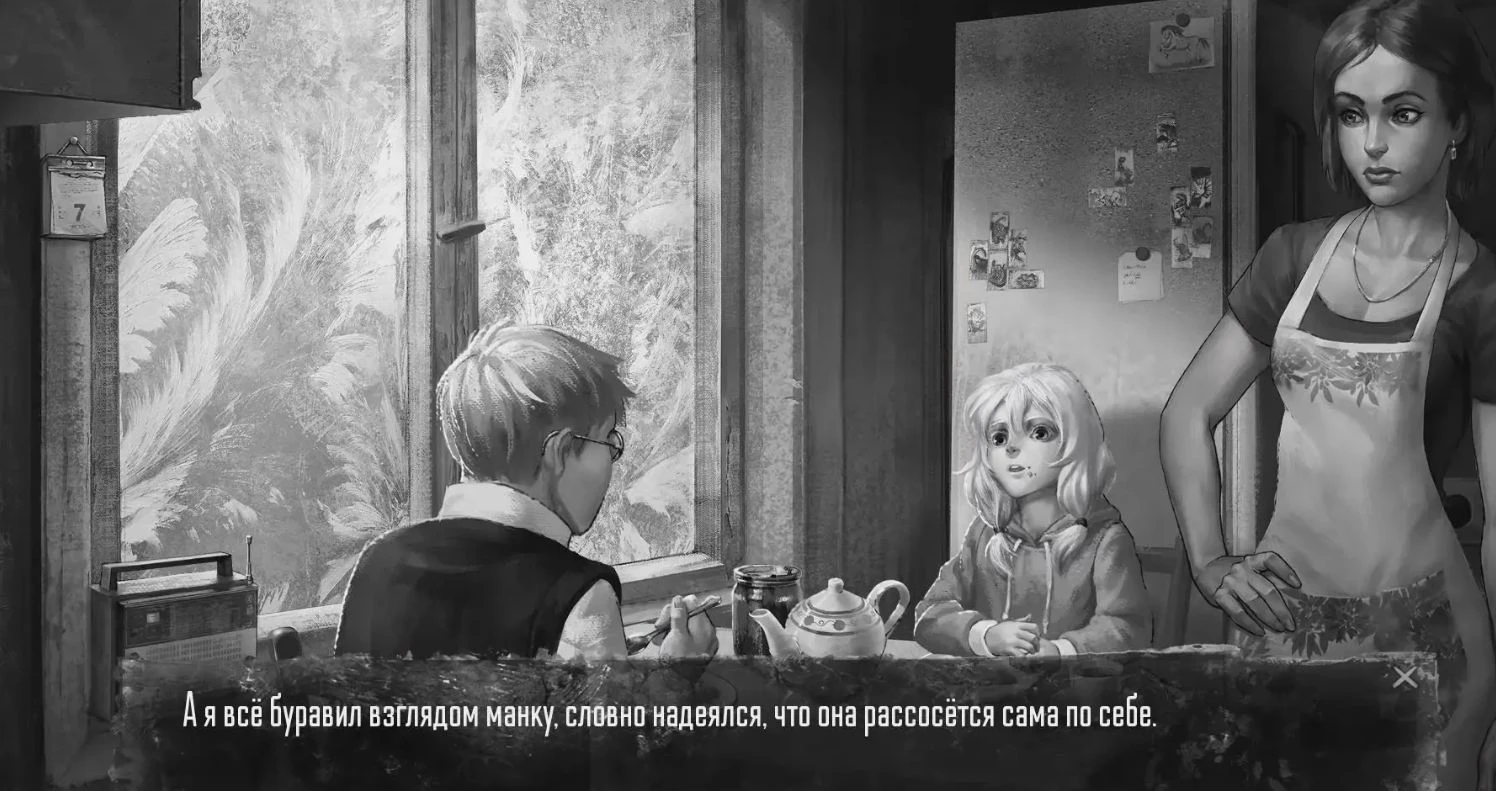 На кухне сначала изучите все активные объекты, а затем поговорите с мамой, чтобы Антон смог обмануть ее и вывести из комнаты. Дважды щелкните по настенному календарю, затем по газете на столе. Несколько раз щелкните по радио на подоконнике, пока не услышите детскую считалку. Осмотрите листок с номером Тихонова на холодильнике, но мама не даст его снять. Откройте холодильник и осмотрите содержимое морозильной камеры. После того как Антон обманет маму, обязательно вернитесь и снова осмотрите те же предметы, чтобы увидеть новые реплики (только для некоторых). И именно сейчас вы сможете снять листок с номером Тихонова с холодильника.