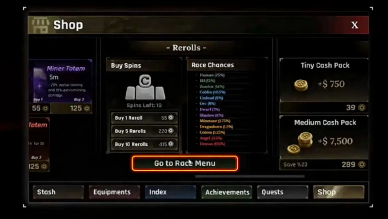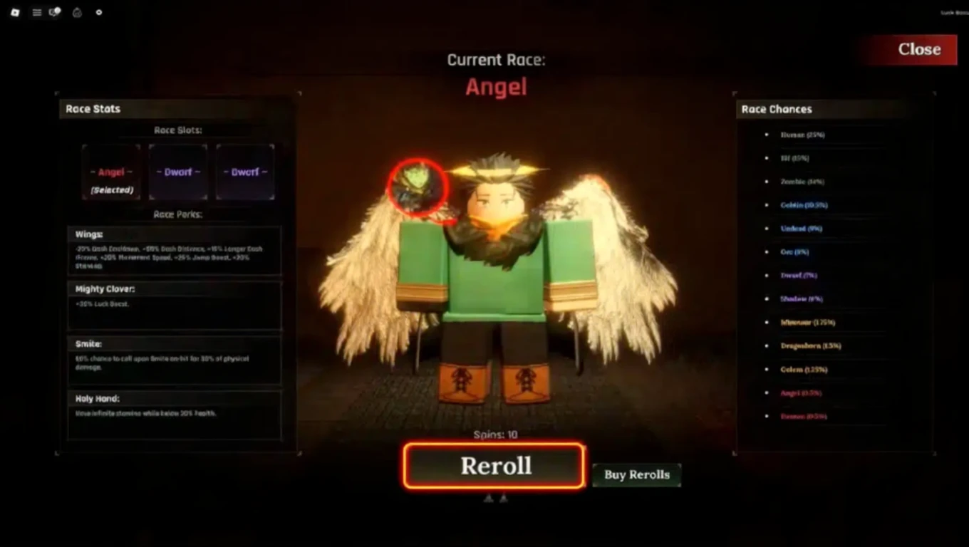 Помимо оружия и брони, в игре можно получить различные расы, среди которых наиболее ценными считаются минотавр, драконорожденный, голем, ангел и демон. Для смены расы необходимы "рероллы", которые можно приобрести за премиальную валюту или получить, активировав специальные промокоды.