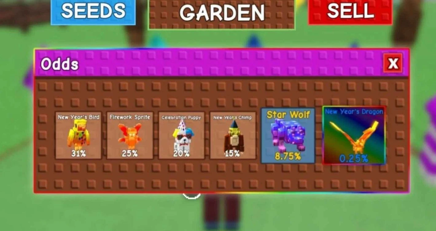 Новогоднее яйцо – 1 триллион шекелей или 120 Robux. Семя Блестящего кусочка – 100 миллионов шекелей, ускоряет вылупление яиц на 5% каждые 10 минут. При наличии средств, приобретите также фейерверки и новогодние украшения.