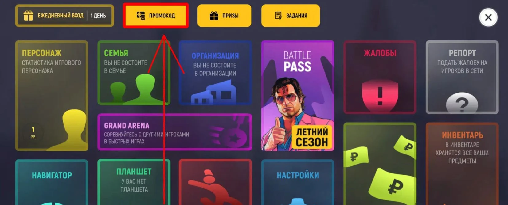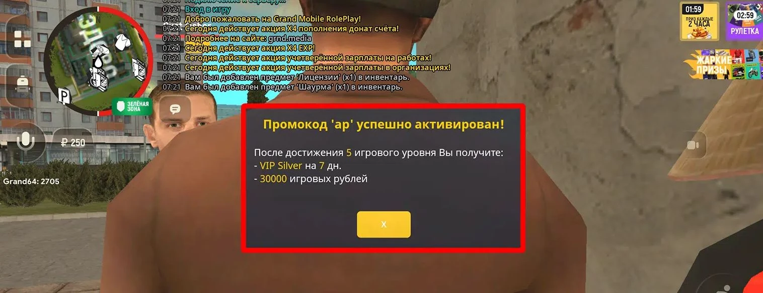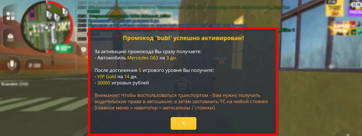 Под сообщением будут указаны условия получения предметов: например, управление автомобилем станет доступно только после получения водительских прав, а денежные средства не всегда выдаются персонажам на начальных уровнях. Учитывайте эти факторы при активации промокода в Grand Mobile.