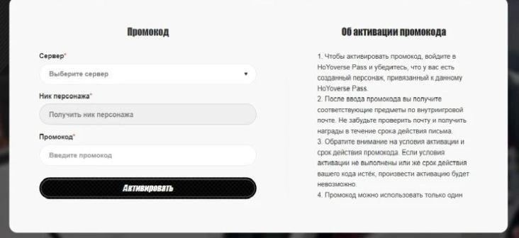Посетите официальный сайт Honkai: Star Rail и авторизуйтесь, используя учетную запись HoYoverse, под которой играете. Выберите сервер, на котором вы играете (вероятно, это европейский сервер). Из предложенного списка выберите своего персонажа. Введите промокод в отведенное для этого поле. Нажмите кнопку "Активировать".