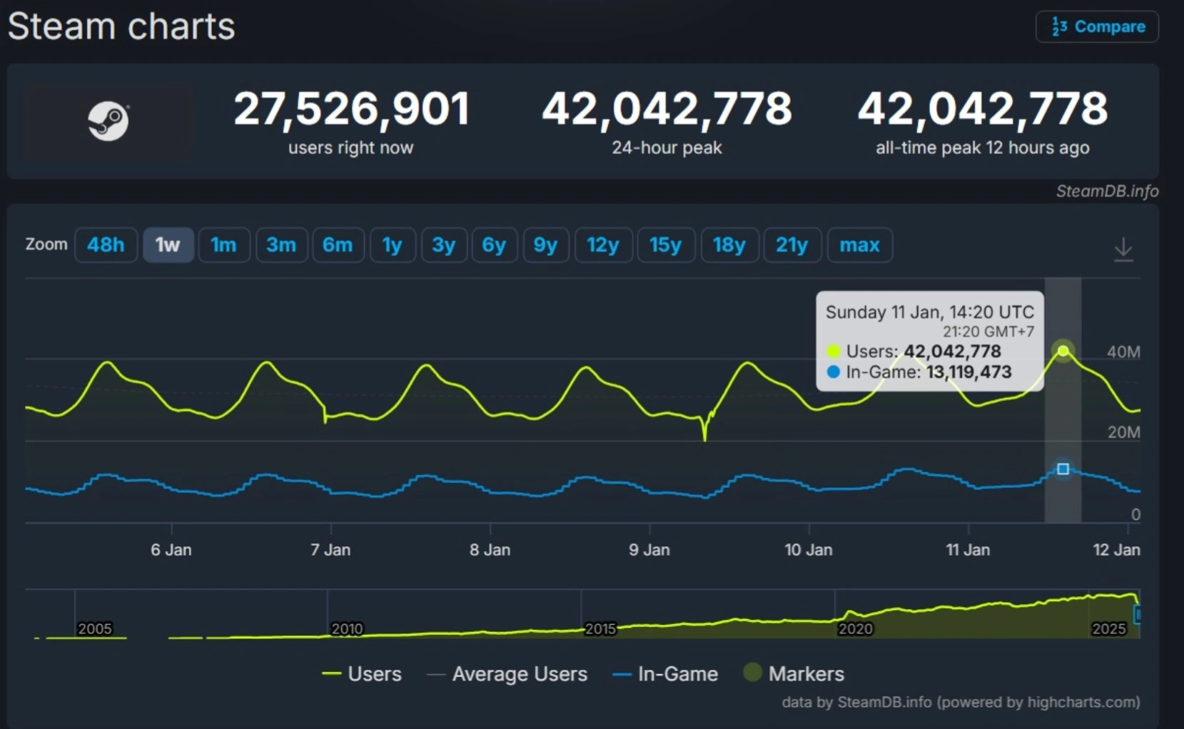 11 января 2026 года Steam зафиксировал новый пик посещаемости, достигнув отметки в 42 042 778 пользователей.