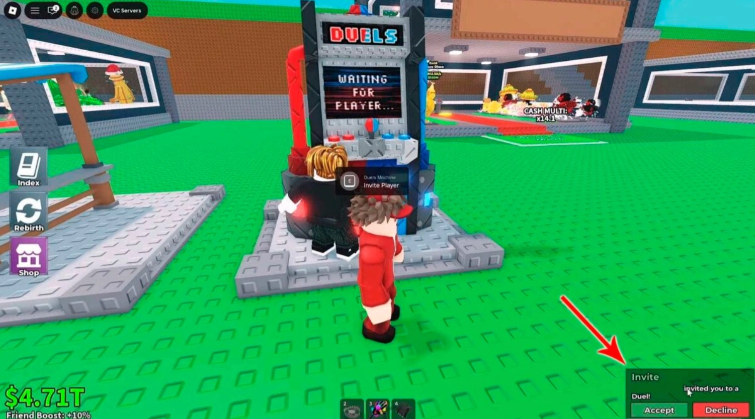Предложить дуэль можно любому игроку на сервере, из списка друзей или через глобальный поиск по нику. Для начала необходимо, чтобы оба игрока были онлайн и приняли приглашение. Чтобы бросить вызов, подойдите к аркадному автомату рядом с продавцом экипировки.
