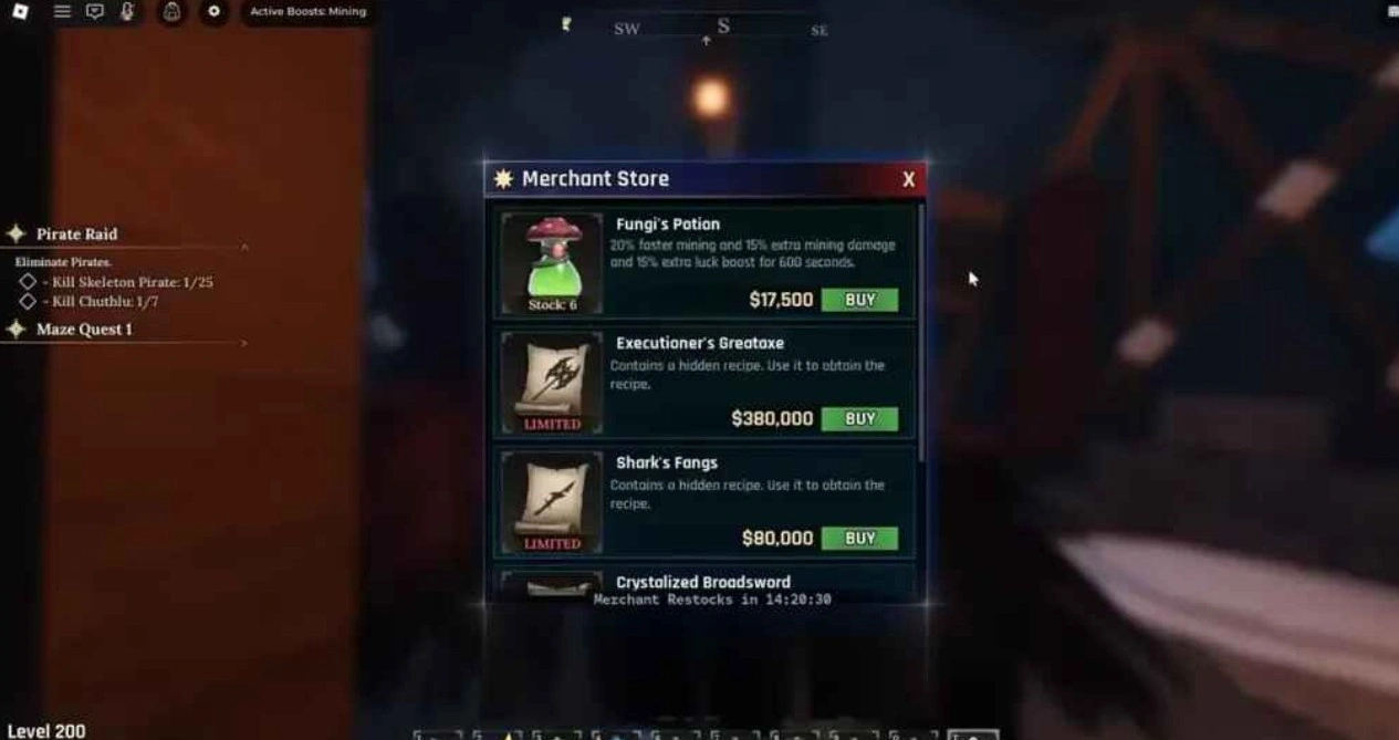 Зелье Гриба | 17500 | +20% скорость добычи, +15–50% урон/удача на 600 сек. В ассортименте сразу шесть таких зелий. |