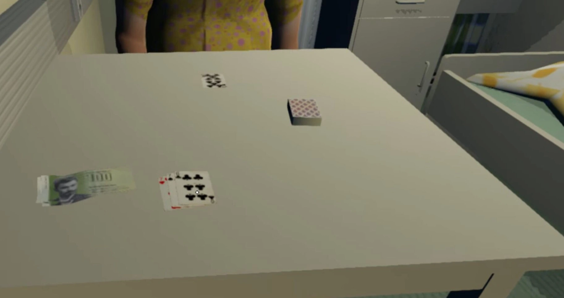 Карты берутся из колоды справа. Ставки делаются на пачке денег слева. Дилер всегда добирает карты после игрока и не останавливается, набрав 17–18 очков. Играя честно, вероятность проигрыша составляет 60–65%: у дилера есть преимущество, и он выигрывает значительно чаще.