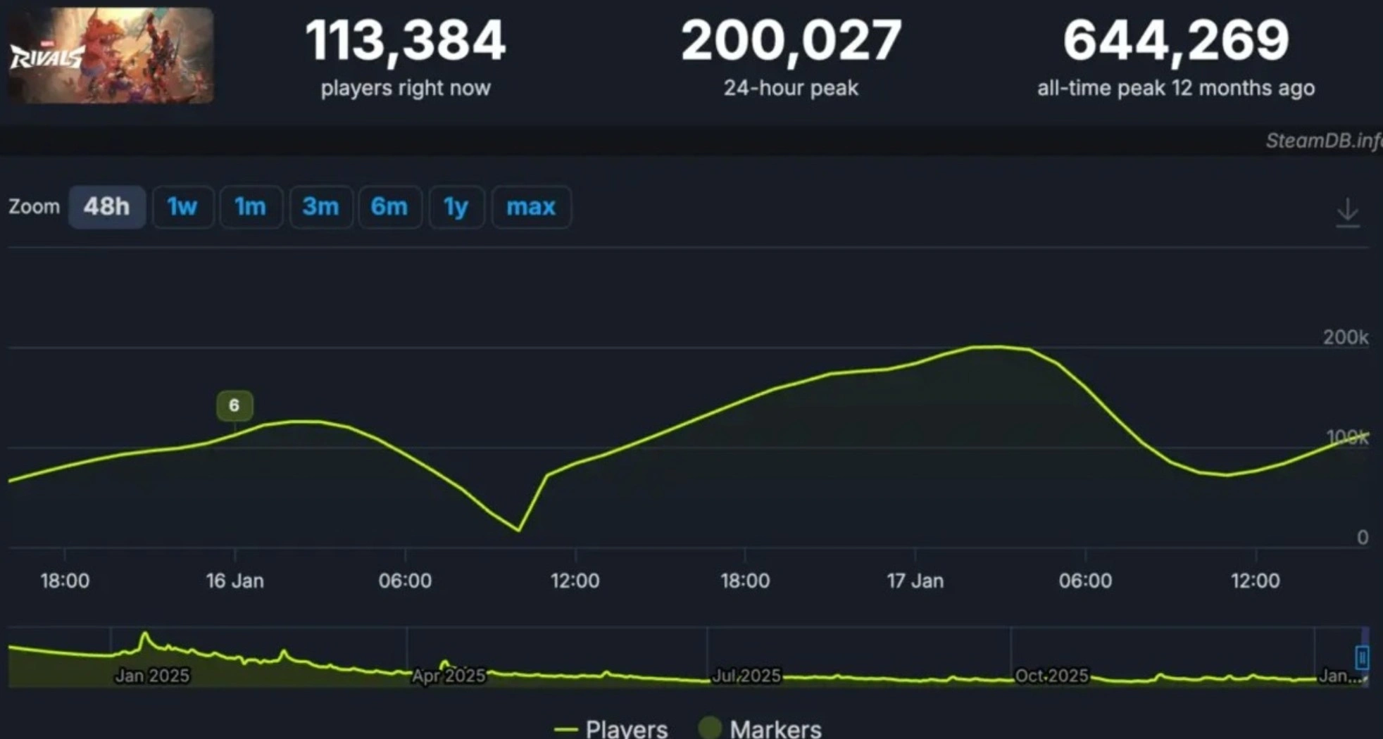 В ночь на 17 января версия для Steam собрала более 200 тысяч пользователей одновременно, достигнув отметки в 200 027 игроков. Стоит отметить, что это только данные по Steam, ведь Marvel Rivals доступна также на PlayStation и Xbox, где также пользуется популярностью.