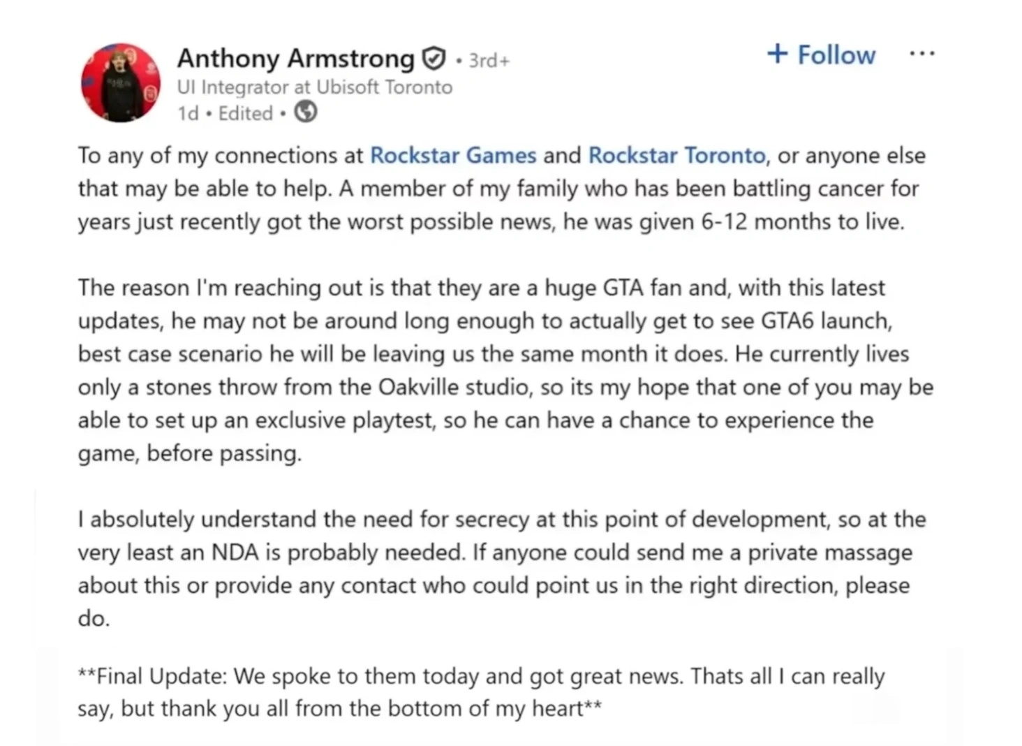 Энтони Армстронг из Ubisoft Toronto обратился к Rockstar с необычной просьбой в LinkedIn. Его родственник, больной раком и преданный фанат GTA, вероятно, не доживёт до выхода шестой части. Энтони попросил организовать для него закрытый плейтест, тем более, что больной живёт рядом с офисом Rockstar.