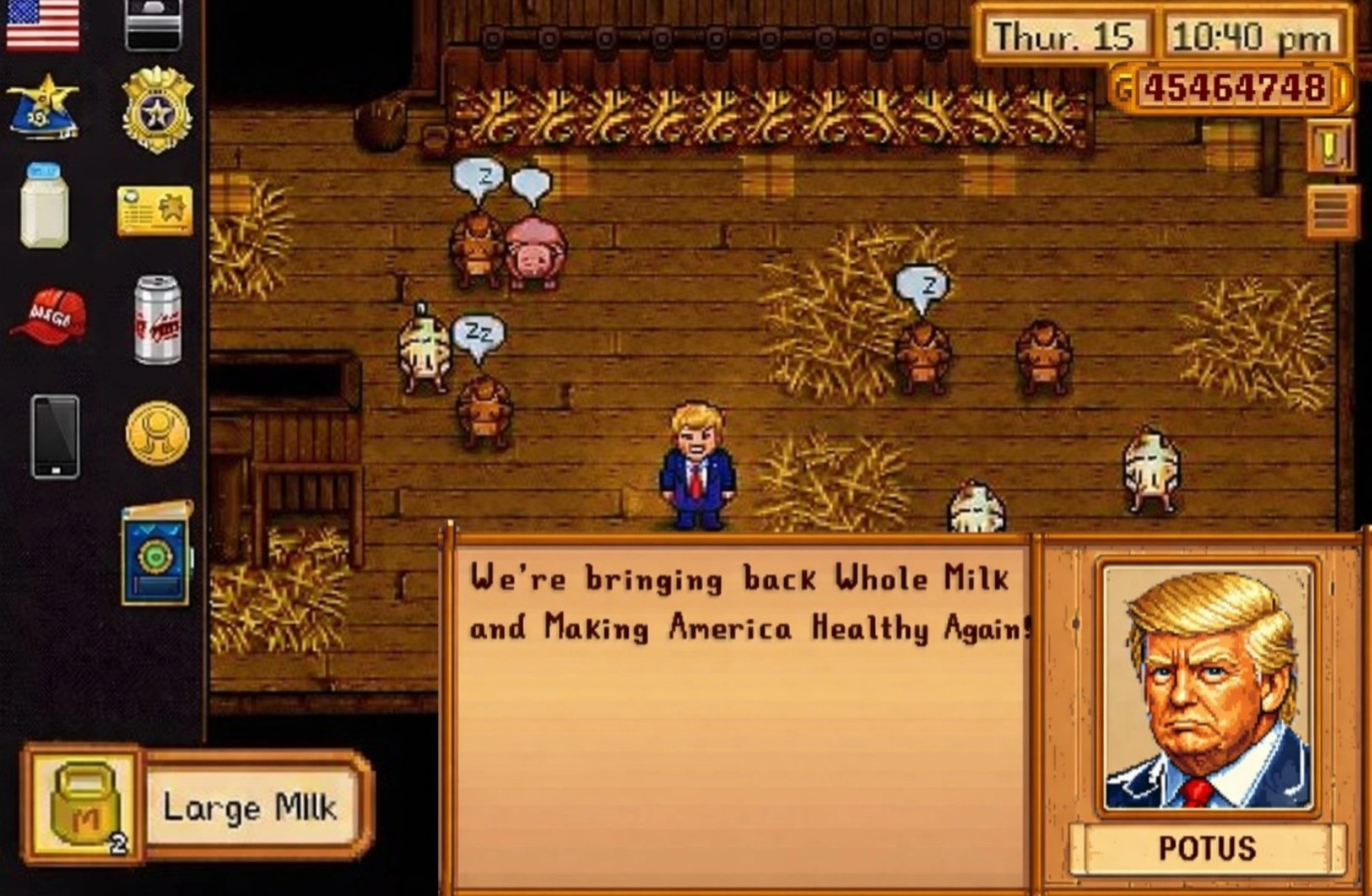 Американское правительство не оставляет попыток привлечь внимание геймерского сообщества. Недавно в официальном аккаунте Белого дома появилось изображение президента Трампа, интегрированное в мир Stardew Valley. На картинке политик, окруженный коровами в амбаре, заявляет о намерении "вернуть здоровье стране" посредством производства натурального молока.