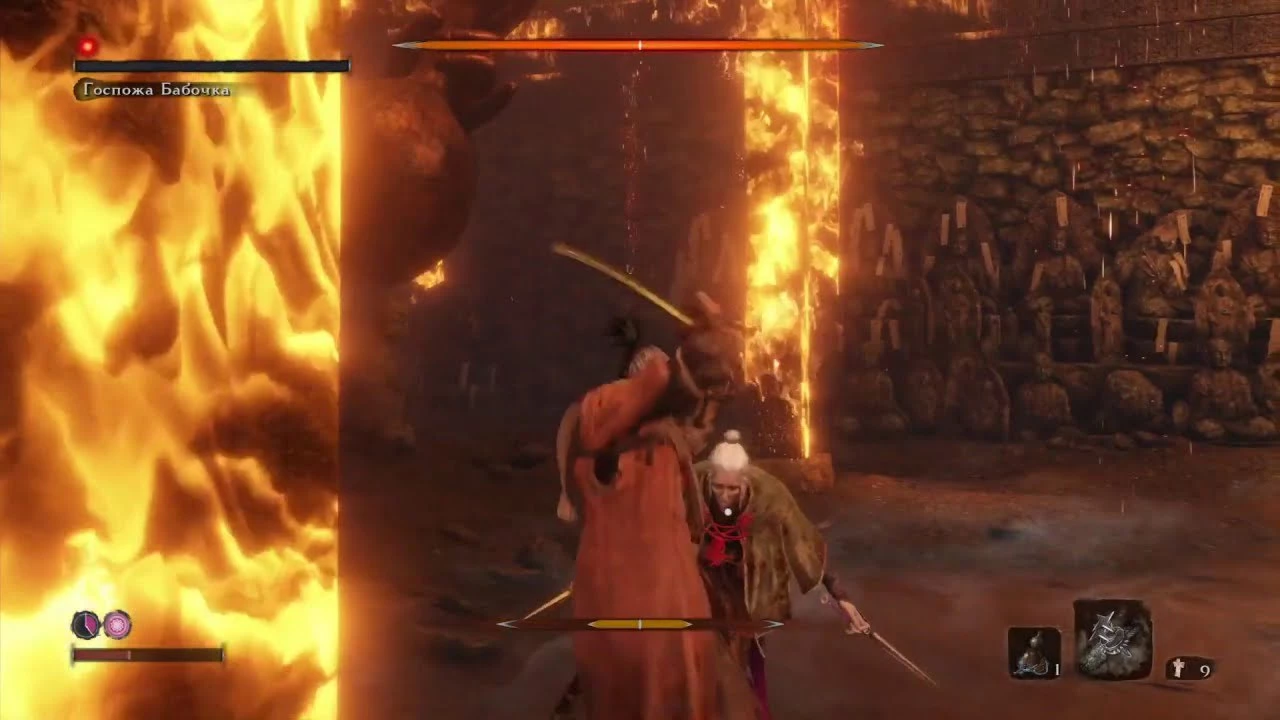 Пожалуй, первый серьезный босс в Sekiro: Shadows Die Twice. Битва с ней проходит в Поместье Хирата, где она будет ждать вас в Потайной комнате. Бой делится на две фазы. В первой старайтесь наносить одну-две атаки, после чего делать рывок в сторону, чтобы обойти Бабочку. Делайте это в тот момент, когда она будет замахиваться. Если она прыгнет вверх и захочет нанести особой удар, сбейте его при помощи сюрикена. Когда вы отнимите одну жизнь у Бабочки, начнется вторая фаза. Теперь она будет призывать духов. Когда они появятся на карте, не сражайтесь с ними, а просто отбегите подальше. Спустя короткое время духи исчезнут, но на их месте появятся сферы, которые полетят в вас. Чтобы они не попали и не нанесли урон, скройтесь за балкой, после чего бегите к Бабочке и по той же схеме атакуйте ее.
