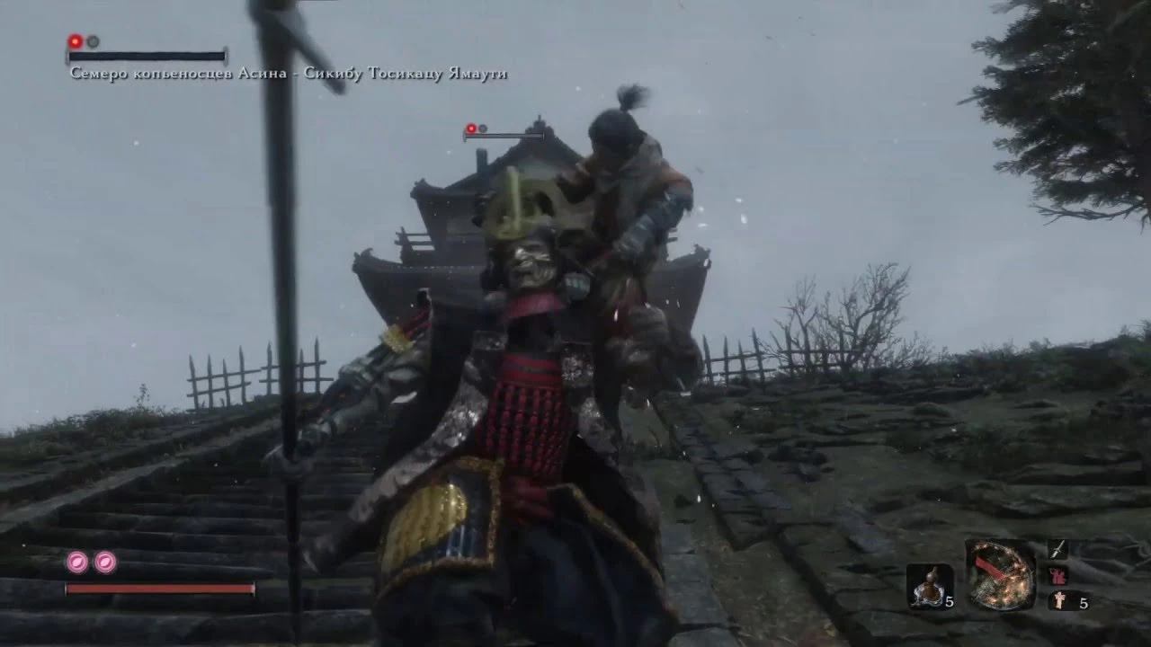В битве с этим мини-боссом помогает та же тактика, что и в случае с Наомори. Единственное, что стоит учесть — находящиеся рядом враги. Убейте их всех, прежде чем вступать в битву с Сикибу.