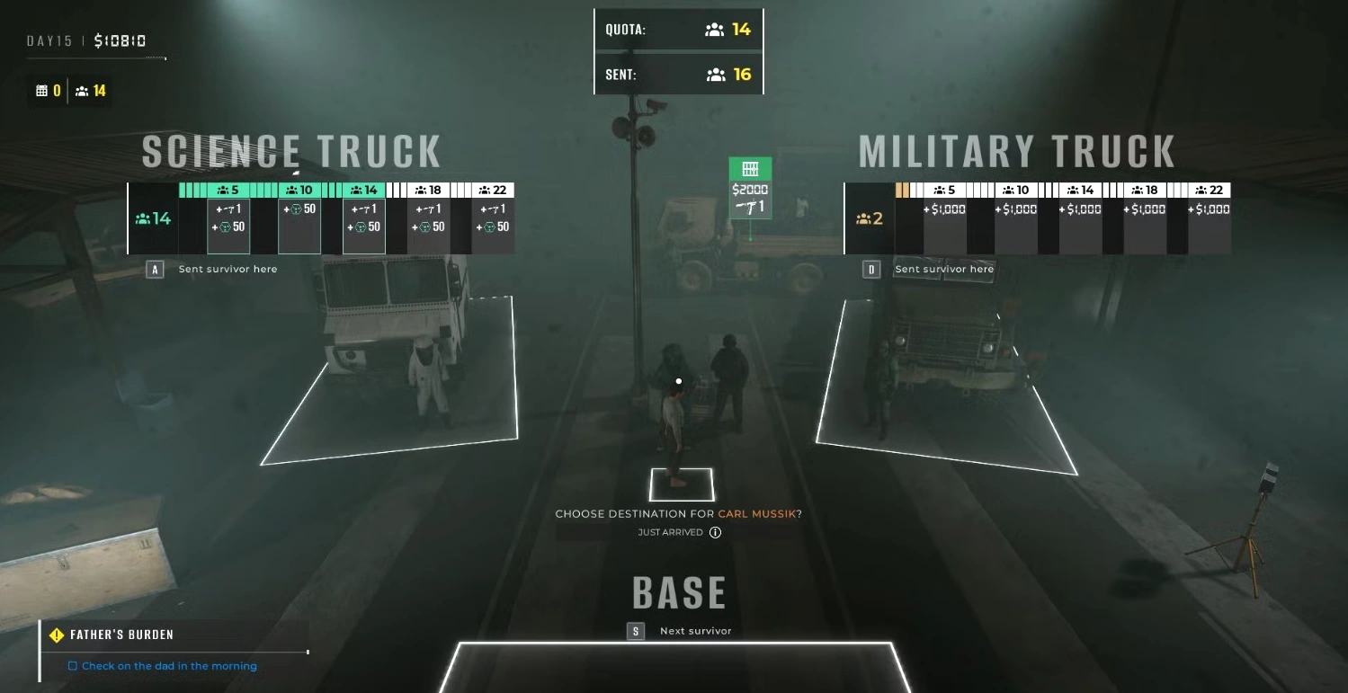 При эвакуации приоритет следует отдавать отправке выживших в грузовик научной группы, что обеспечивает получение как очков исследования, так и диагностических шприцев. Военный грузовик, в свою очередь, предоставляет только денежное вознаграждение.