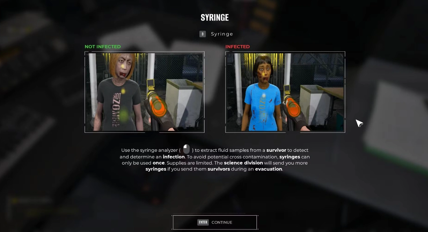 В Quarantine Zone: The Last Check, среди прочих инструментов для определения зараженных, присутствует диагностический шприц. Он станет доступен после успешного завершения второй эвакуации, запланированной на десятый день сюжетной линии. Важно помнить об ограниченном количестве этих шприцев и использовать их рационально.