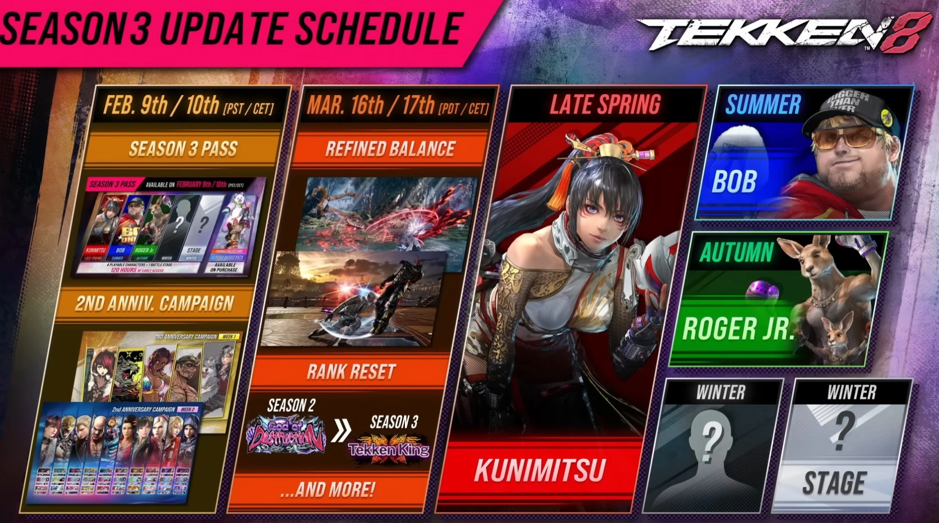 Весной появится Кунимицу из Японии. Летом к ростеру присоединится Боб из США. Осенью в игру добавится Роджер младший из Австралии, представляющий собой уникальный дуэт кенгуру и его матери. Зимой ожидается появление еще одного секретного бойца, а также новой арены. Владельцы сезонного пропуска смогут получить ранний доступ к этим новинкам, начиная с 9-10 февраля (дата зависит от региона).