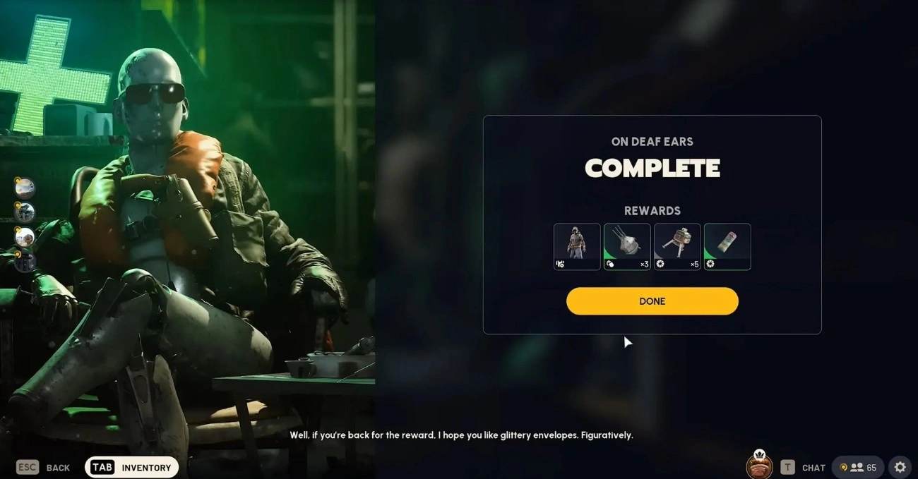 В награду за успешное выполнение квеста Лэнс выдаст вам 3 маскировочные гранаты, 5 шумовых устройств, 1 шейкер, а также косметический предмет – тёмно-синюю расцветку для костюма «Страж».