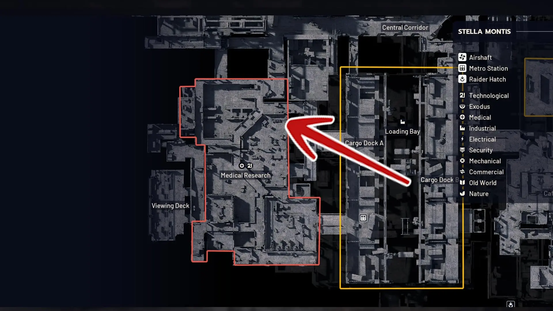 Эта зона расположена в западной части карты. По пути вам нужно пройти через Связь или Атриум, а затем через Погрузочную зону, чтобы попасть в Медицинские исследования.