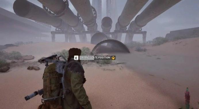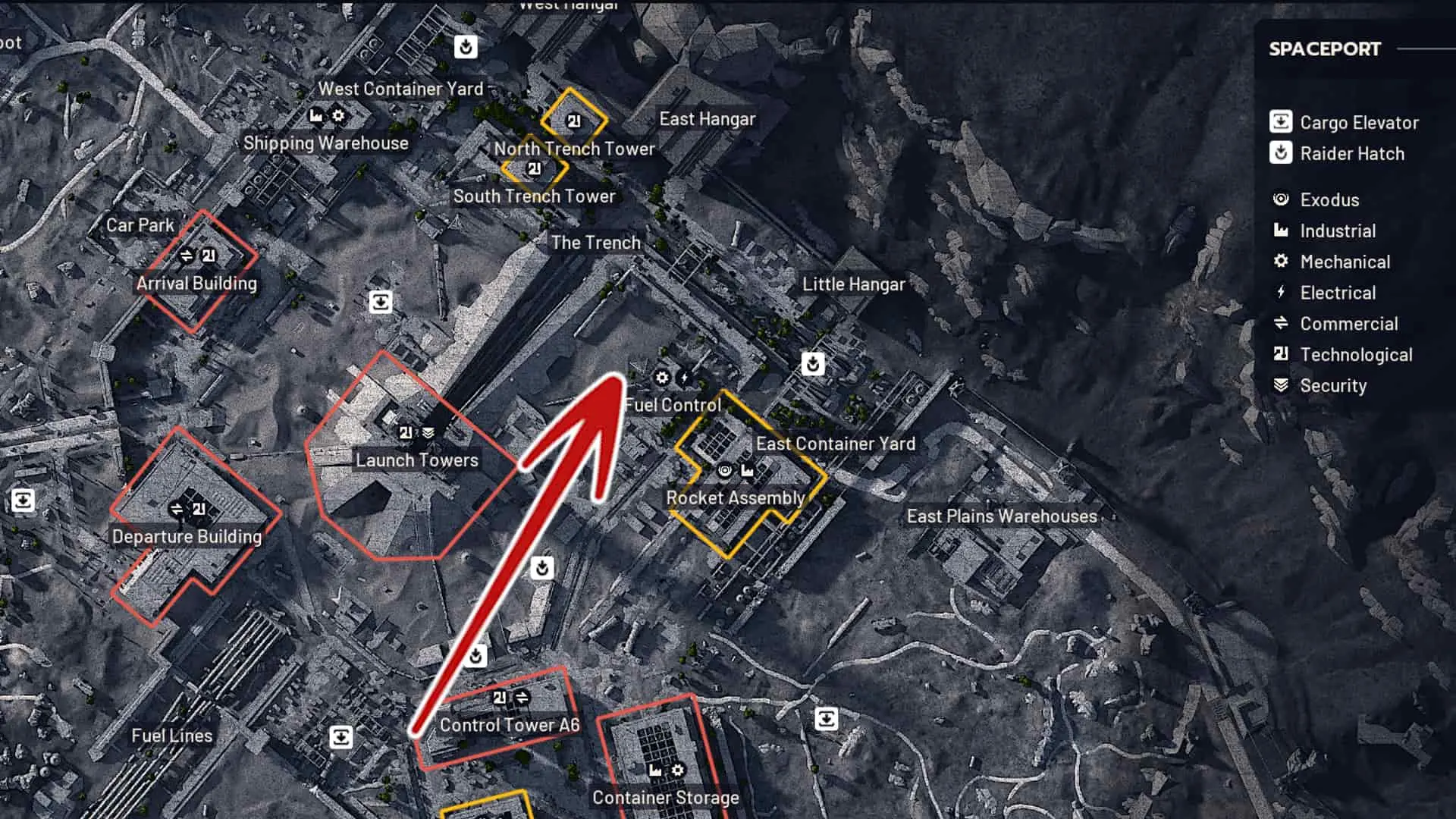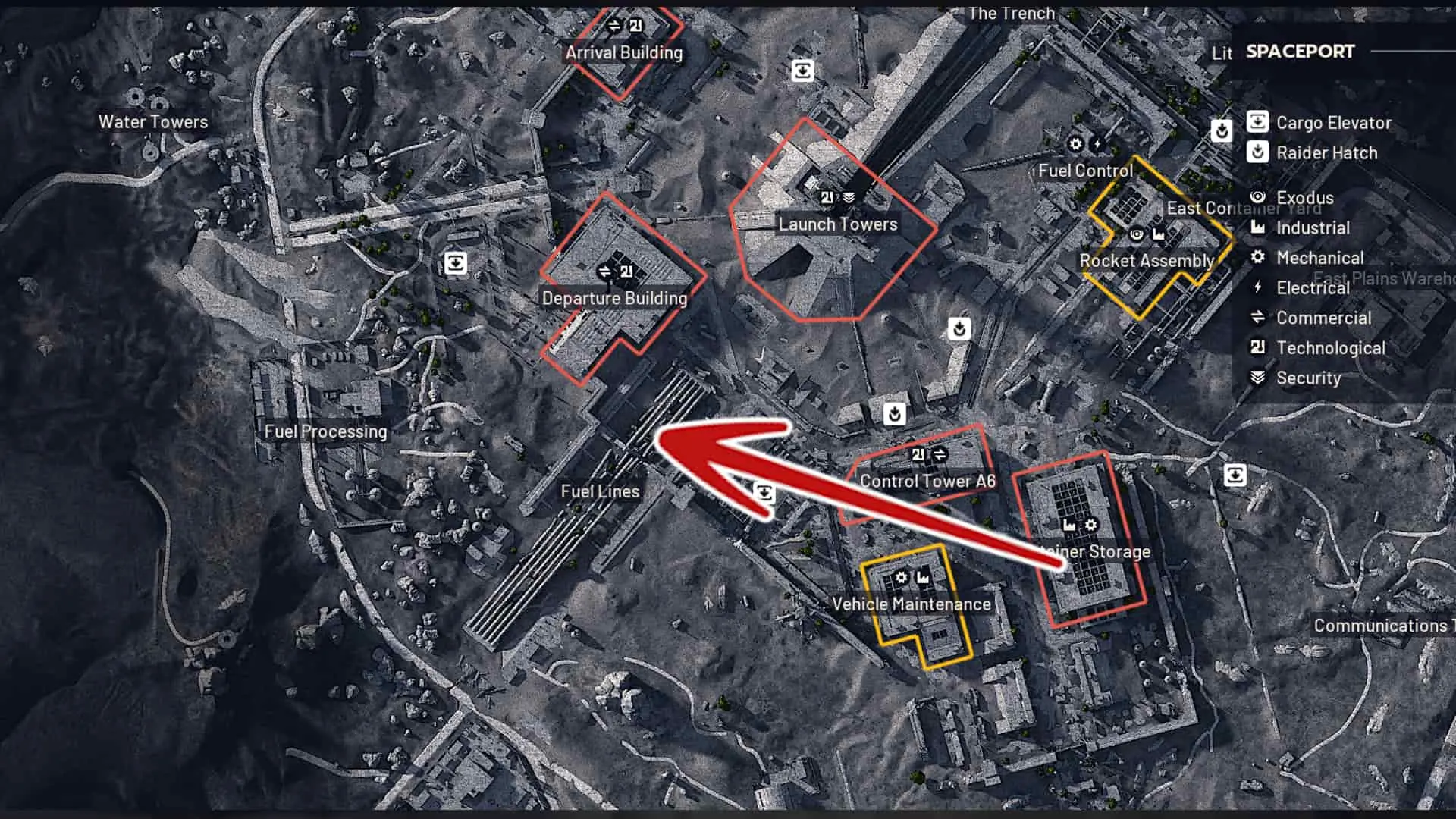 Придерживайся северной стороны топливных магистралей, двигаясь в направлении здания вылета. Ищи место, где трубы кажутся оборванными. В центре ты увидишь парящую точку взаимодействия. Активируй ее, чтобы получить следующую метку возле "Контроля топлива".