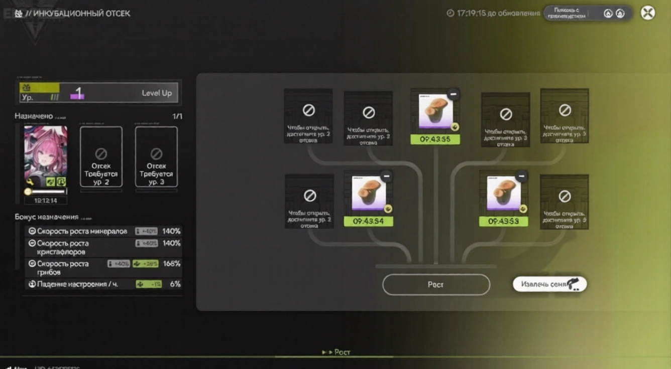 После получения первого гриба можно организовать производство на корабле. Улучшите нексус ОМК Дицзян до второго уровня и получите доступ к инкубационному блоку. Из гриба можно извлечь семя для посадки и выращивания. Чем выше уровень отсека, тем больше ячеек для одновременного выращивания доступно.